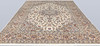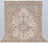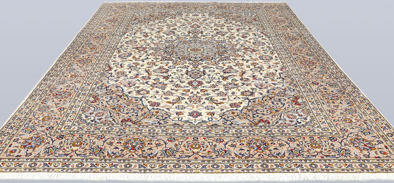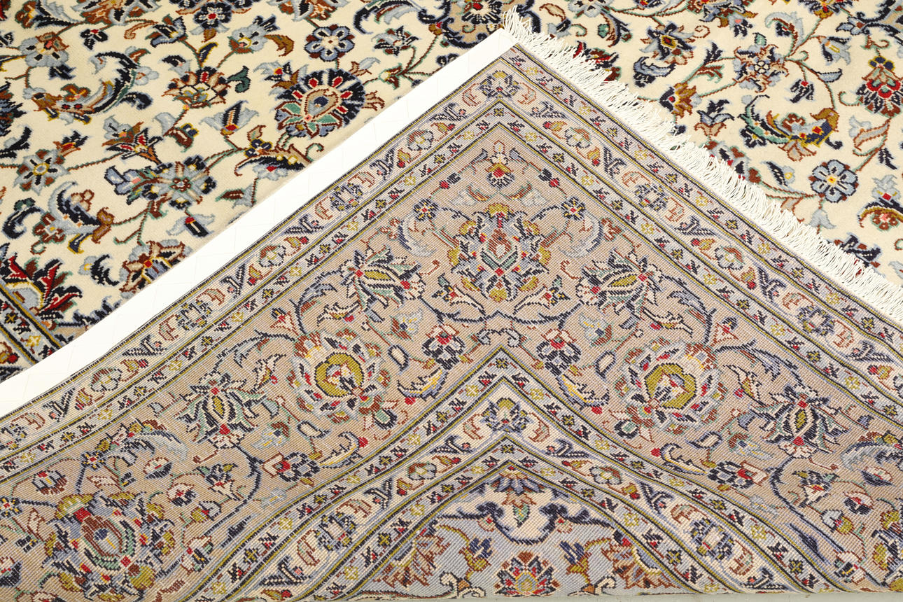 Keshan fine with light bottom color and a centrally placed medallion with details in blue, beige and red. The center field is covered in floral ornamentation, palmettes and arabesques in similar shades, and the corner portions follow the same color scheme as the medallion. The border has a beige bottom and decor of palm branches. The forelock is made of wool and the warp is of cotton.