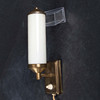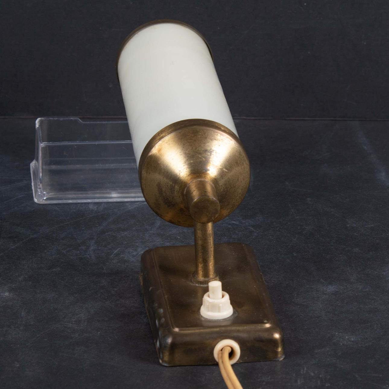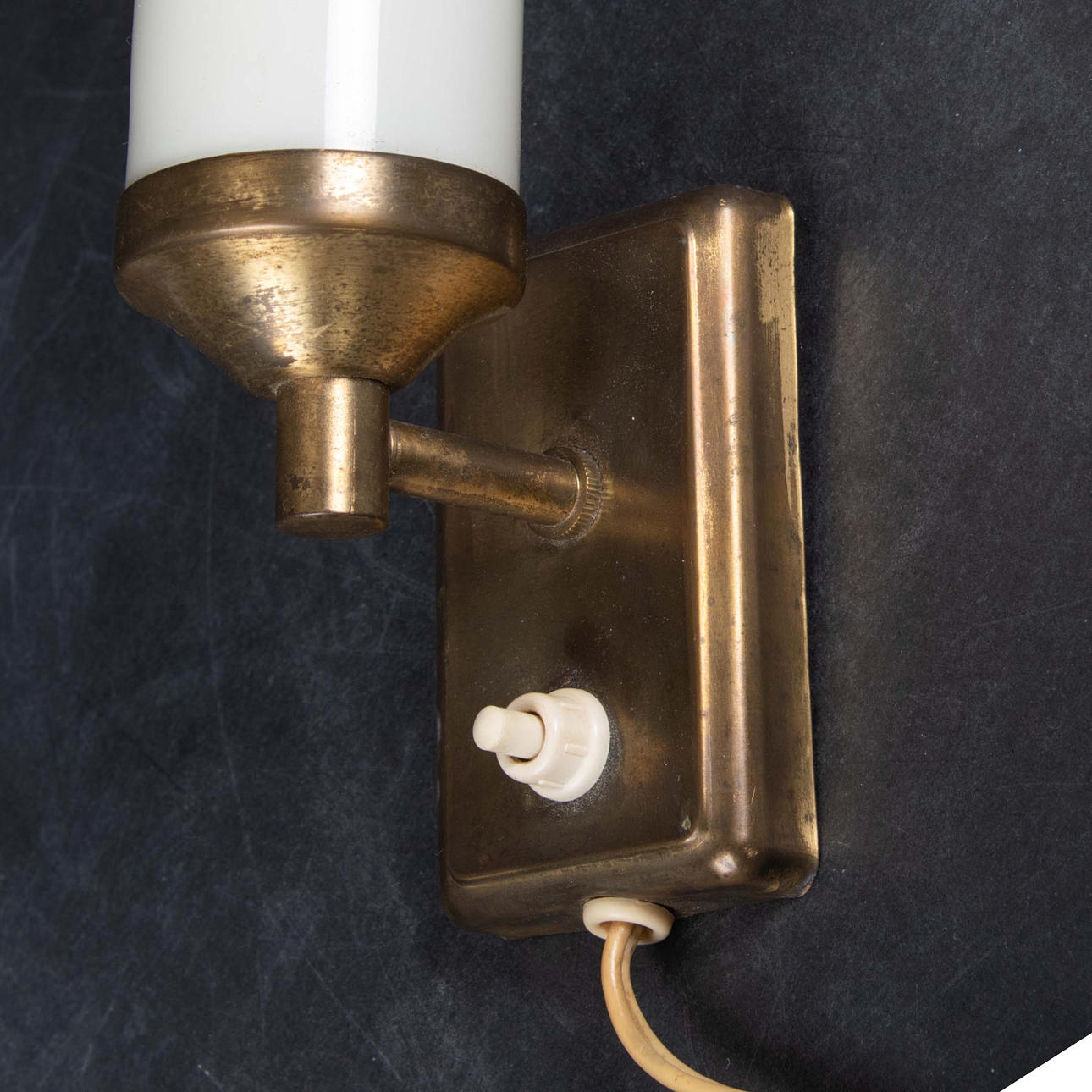 Cylindrical shade in white opal glass with wall bracket in patinated metal. Strict and functional design in a style typical of the period. Switch on the wall plate.