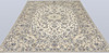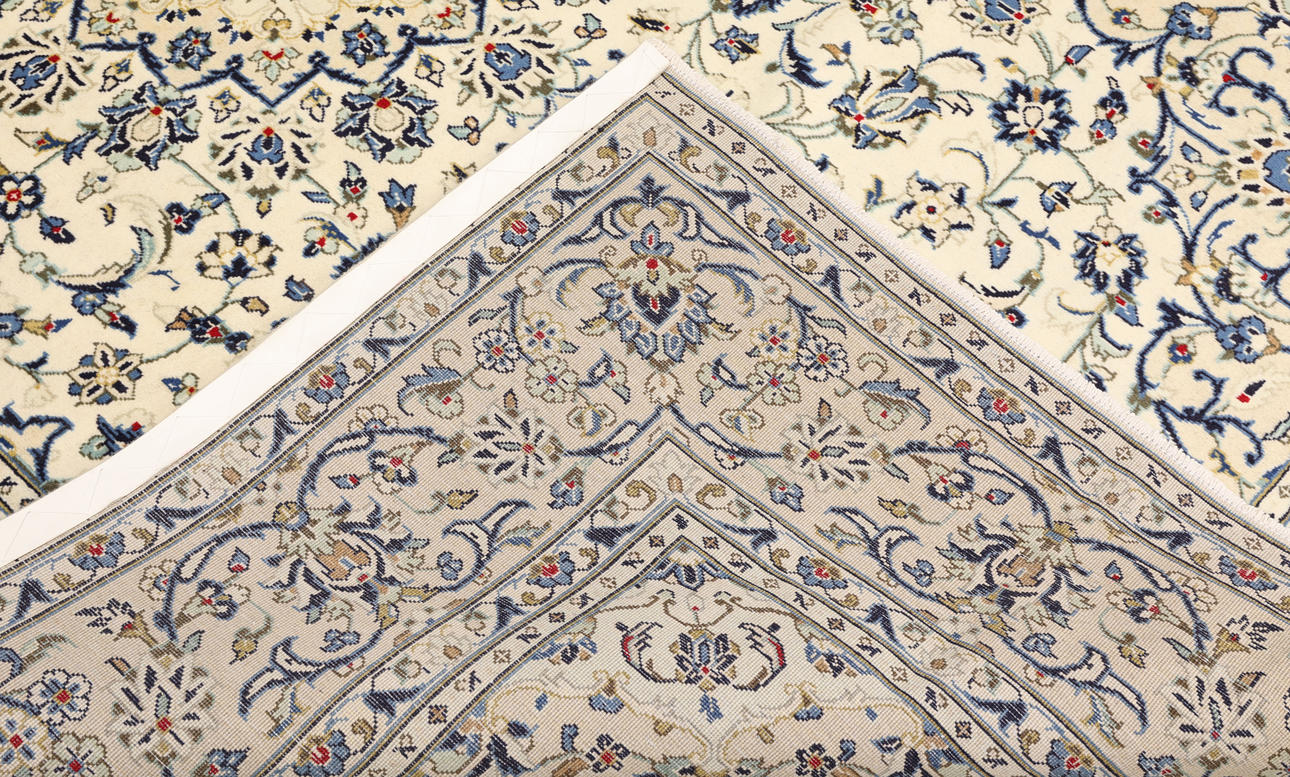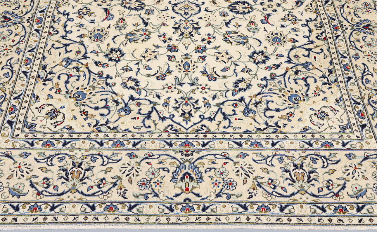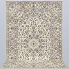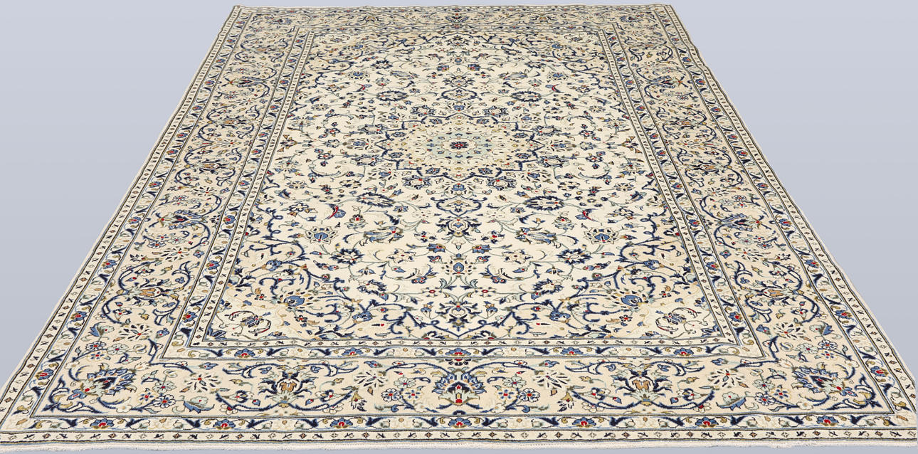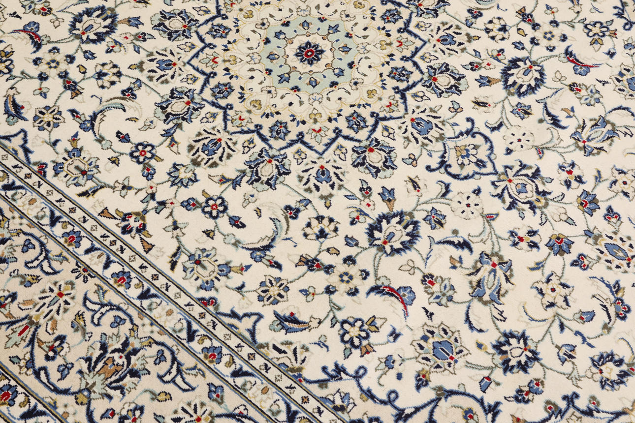 Keshan with a light ground color and a centrally placed medallion with details in blue, beige, yellow, and red. The field is covered with floral ornamentation, palmettes, and arabesques in similar shades. The border has a light ground and decoration of palmette vines. The pile is wool and the warp is cotton.