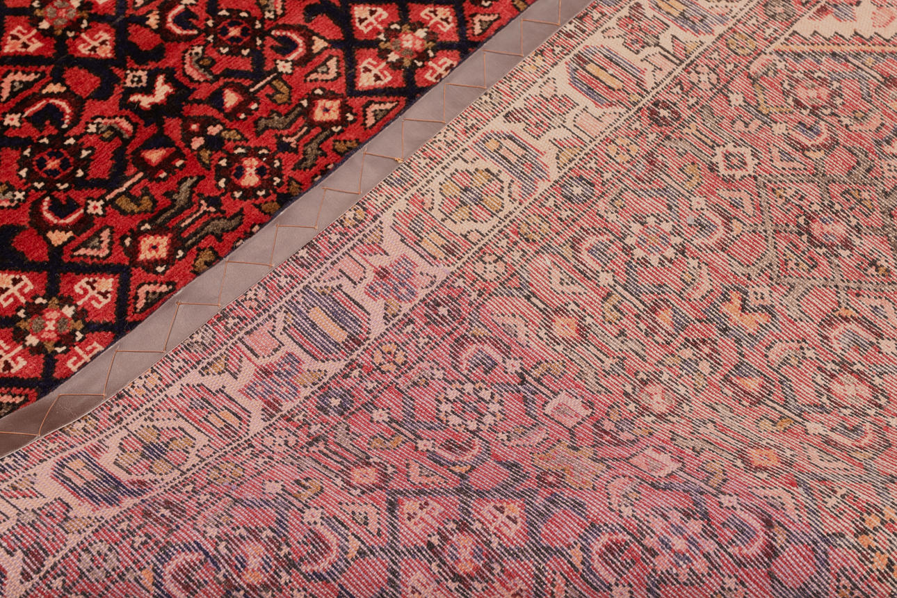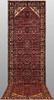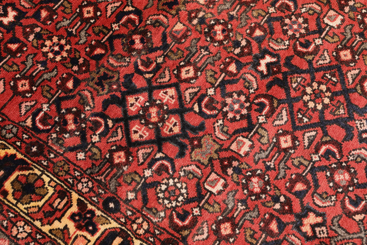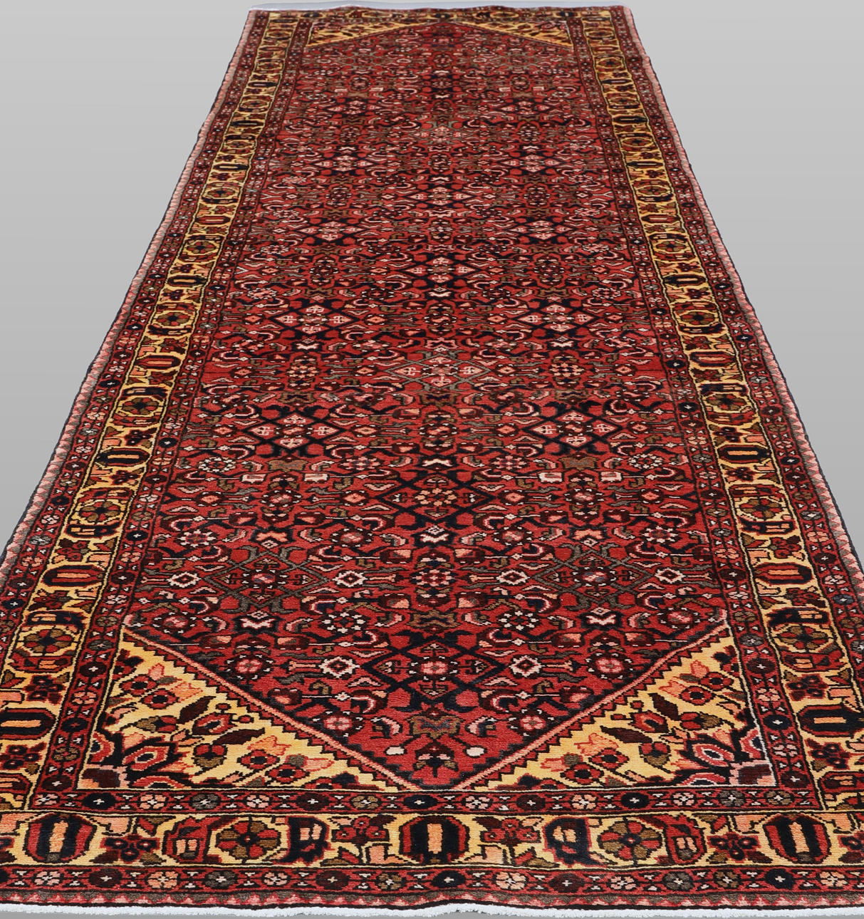 Hamadan runner with a red ground and a field covered in Herati pattern in dark blue, beige, and red details. The border has a yellow ground with geometric decoration. The pile is wool and the warp is cotton.