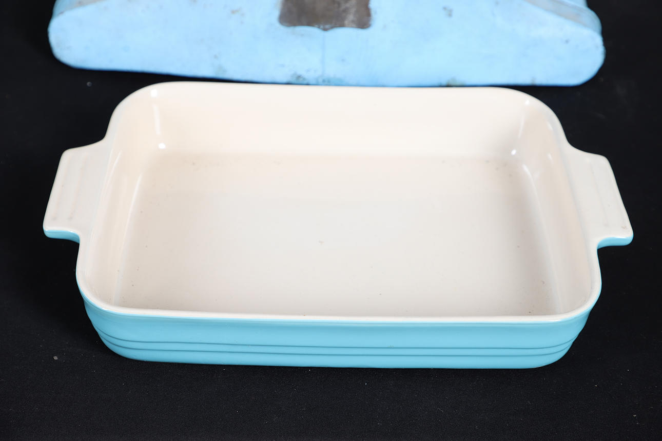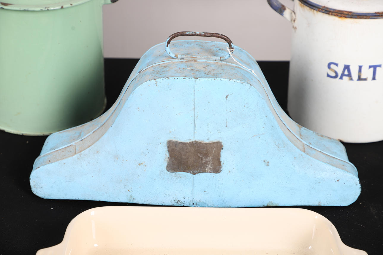 Hat case in two sections, L46cm, also with two metal tins and a ceramic baking tray (4).