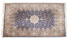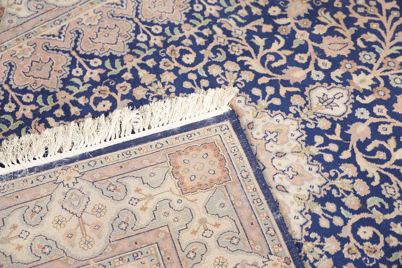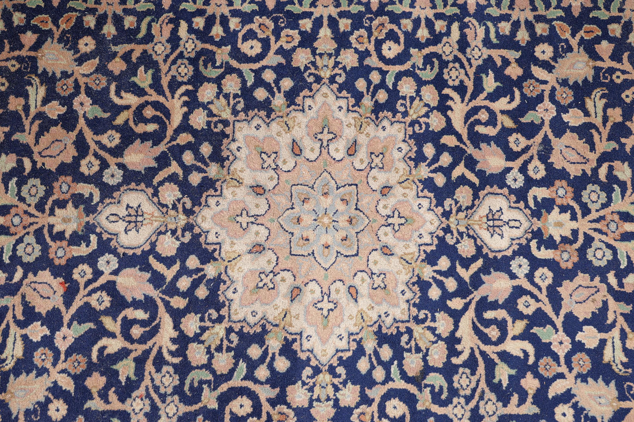 Having a Royal Navy blue ground, decorated with the central ivory medallion and repeating floral designs to the central field, as well as repeating motifs to the borders with tassel ends, 243cm by 170cm.