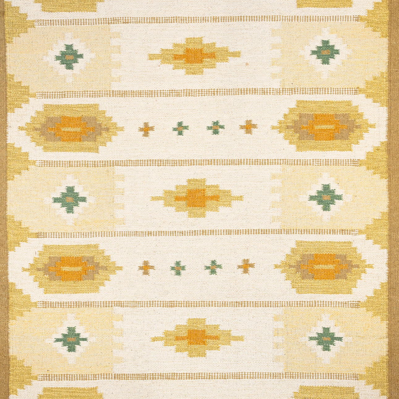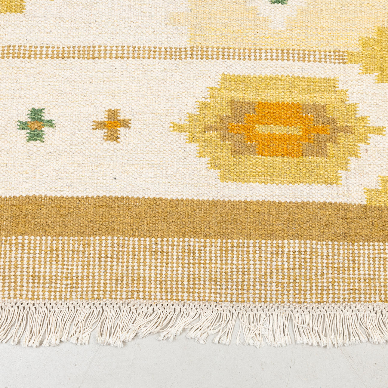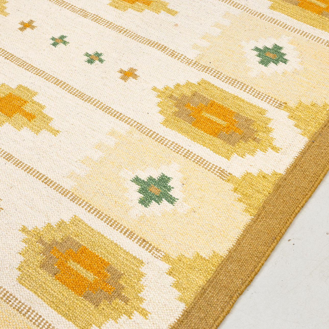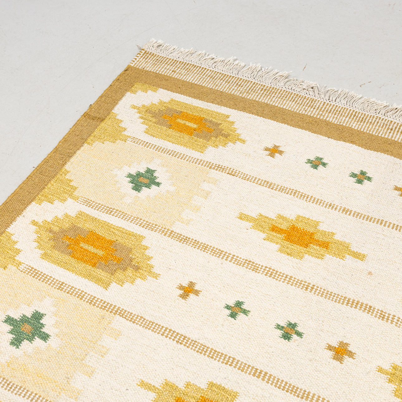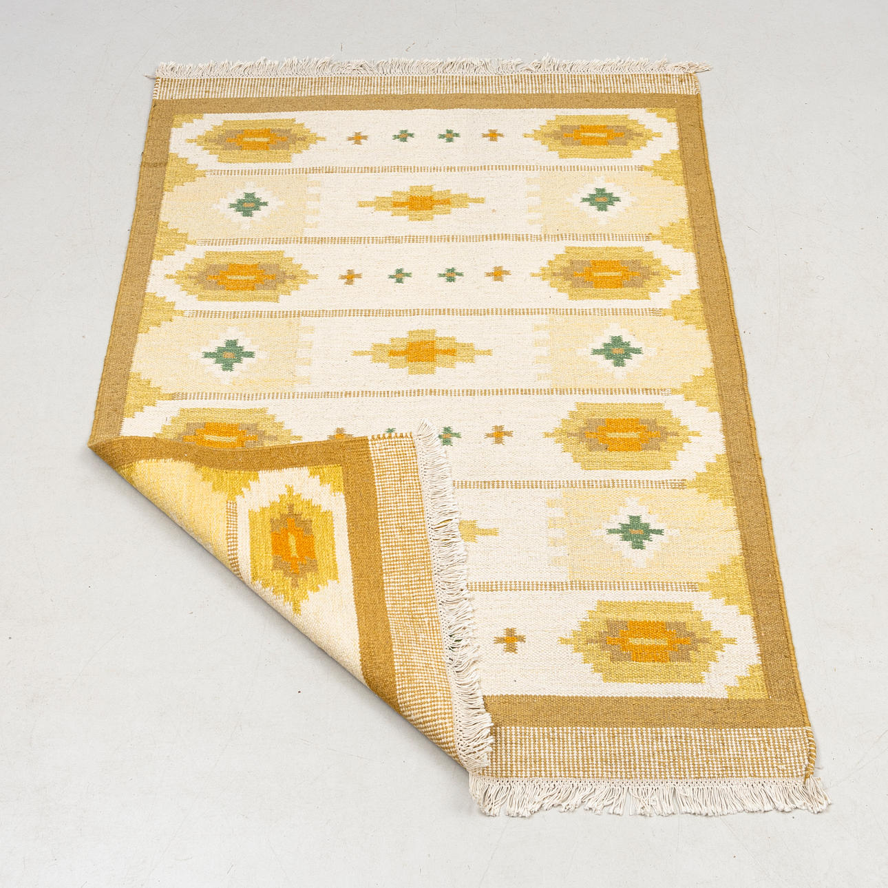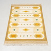 Approx. 200 x 140 cm. Geometric pattern on light base, yellow tones.