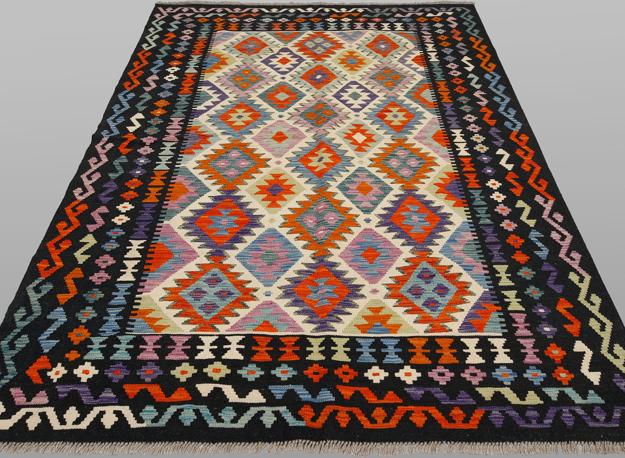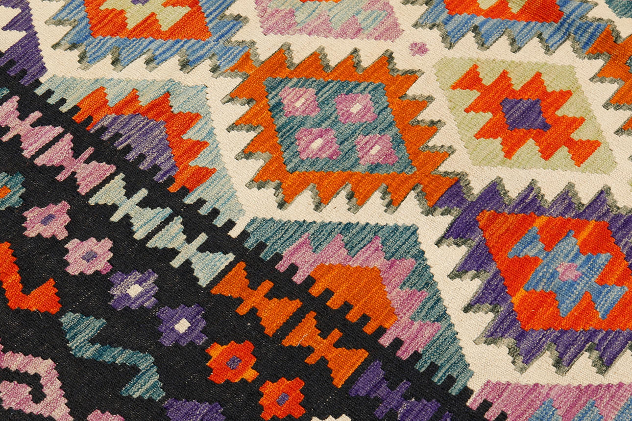 Hand-woven Kelim in classic design with geometric pattern in polychrome color scale.