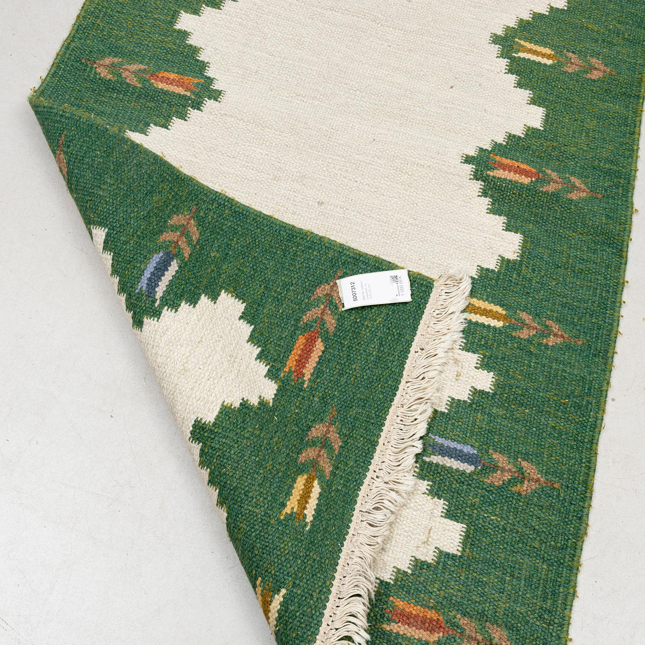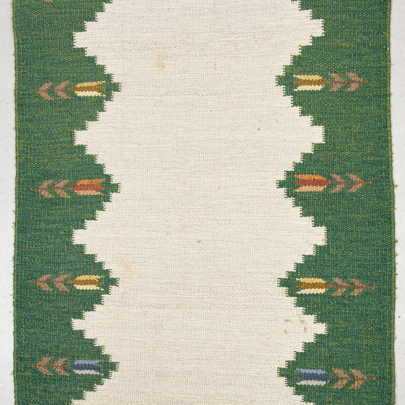 Geometric pattern with tulips on green border. Approx. 154 x 85 cm.