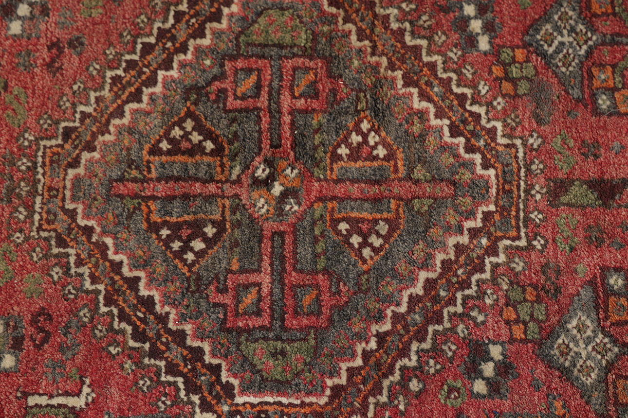 With a large stepped central medallion, predominantly red ground, tassel ends, approx. 169cm long, 112 cm wide.