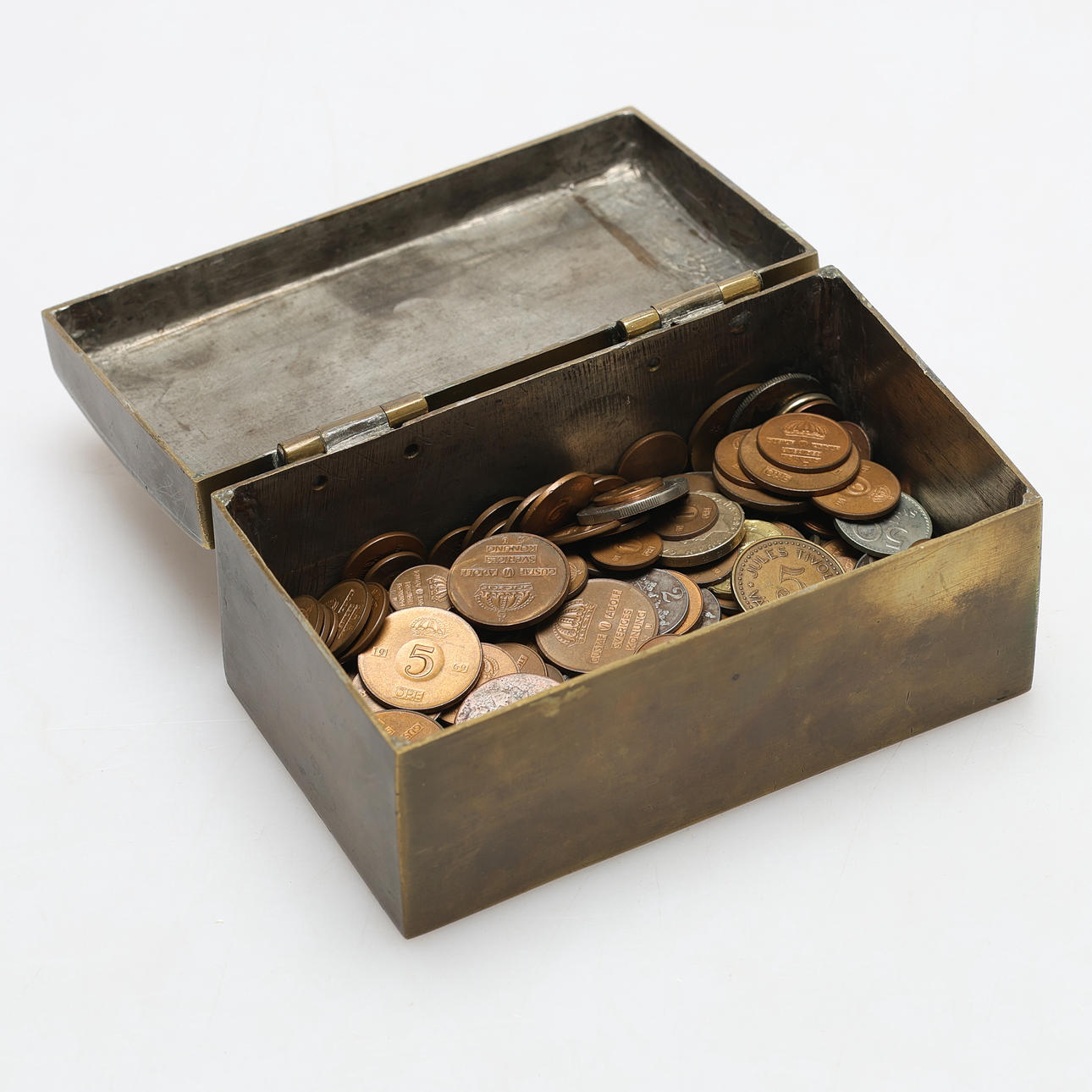 5007539. A brass box, mixed denomination coins, mostly Swedish.