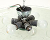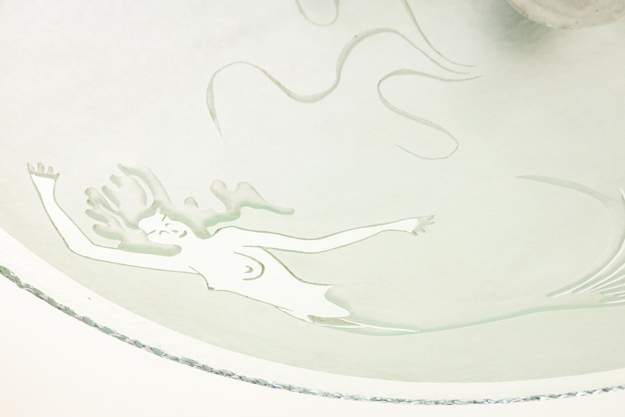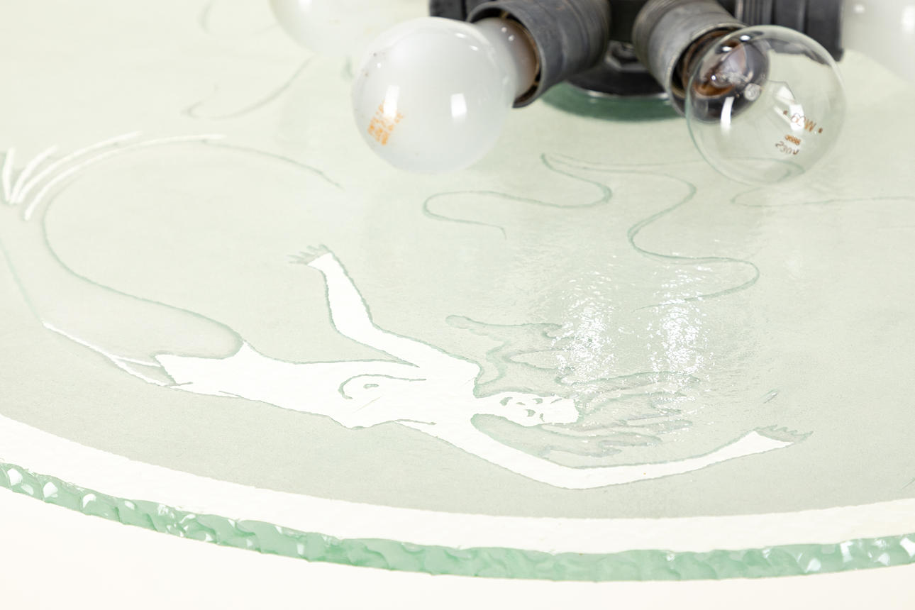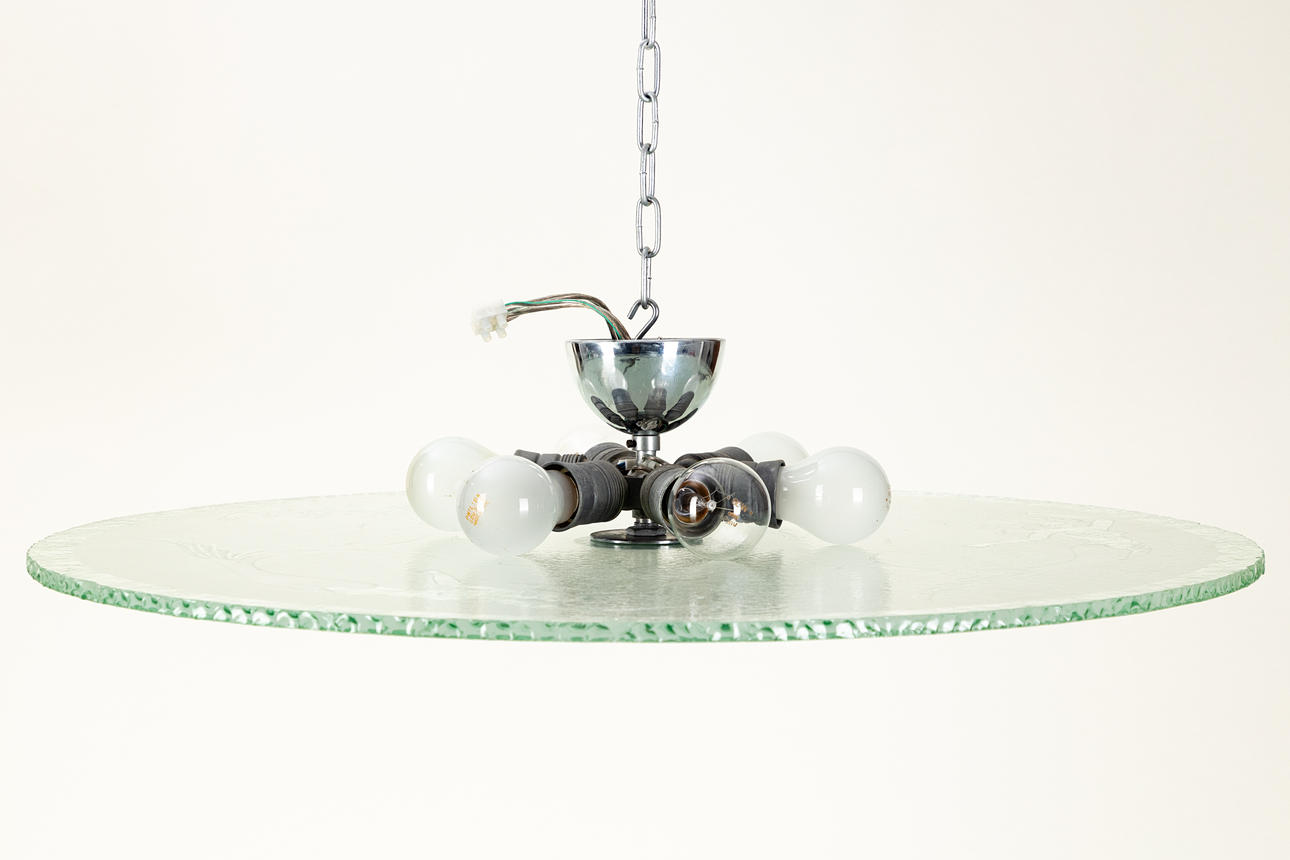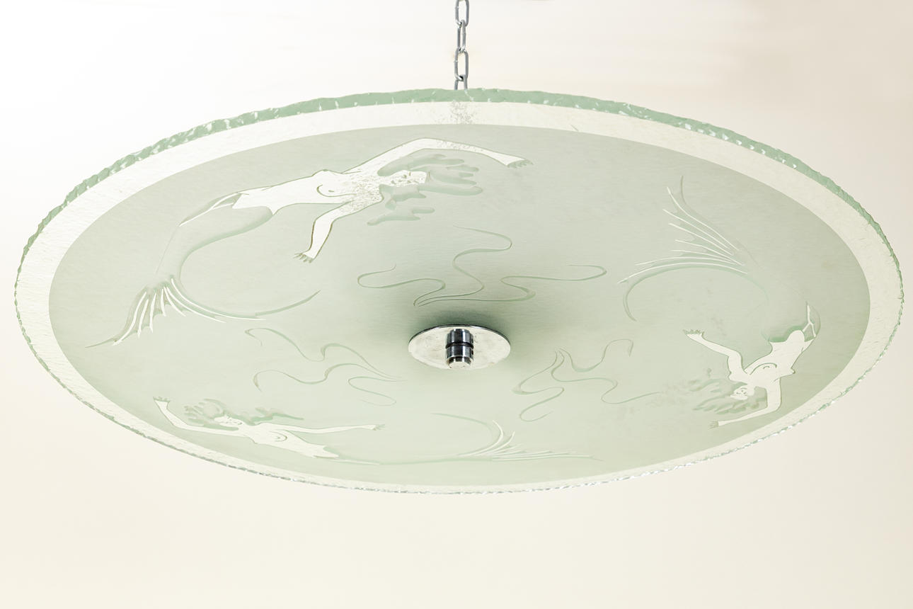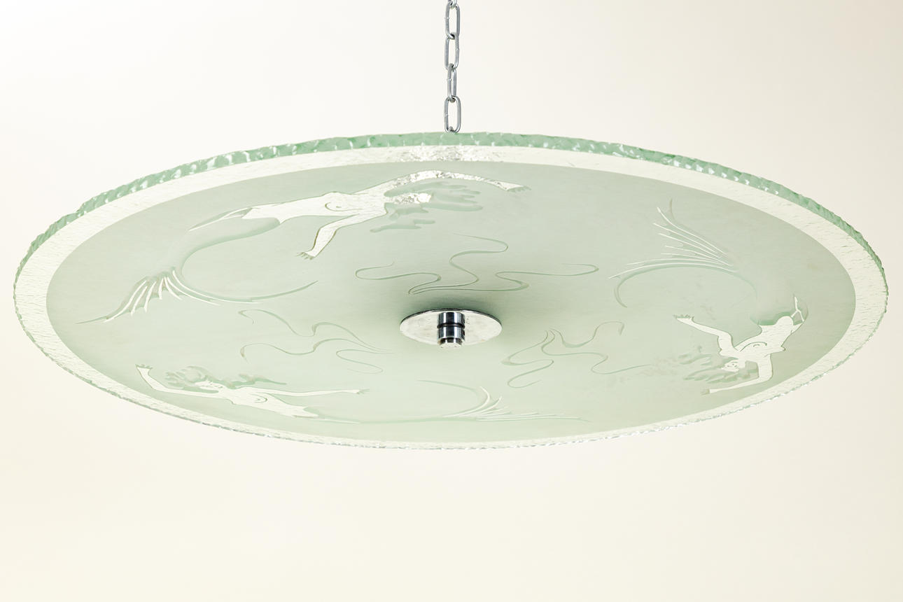 Unknown glassworks. Metal and clear raw glass with siren decoration 6 lamp sockets. Dm. cca 75 cm.