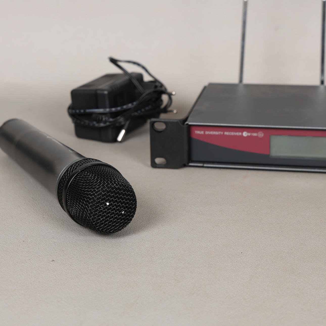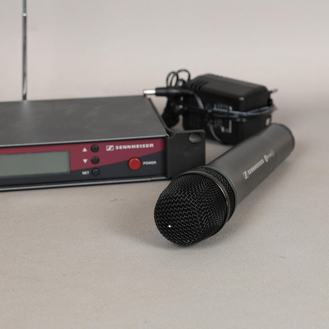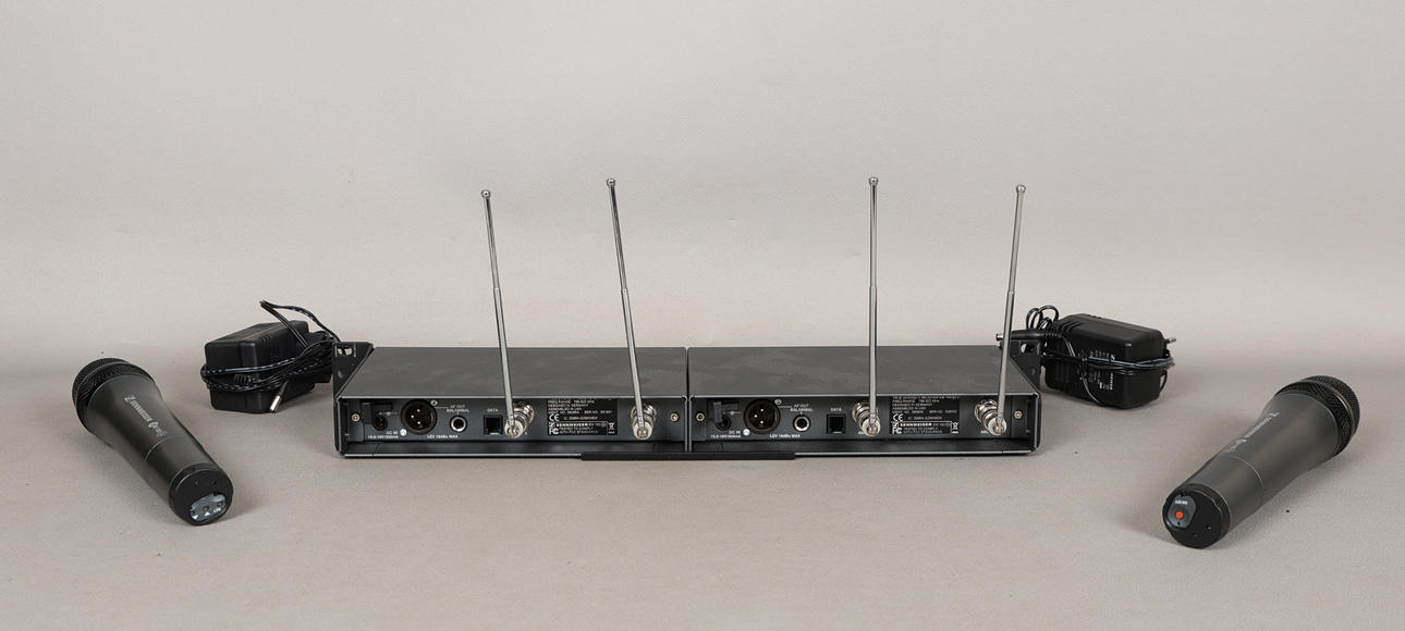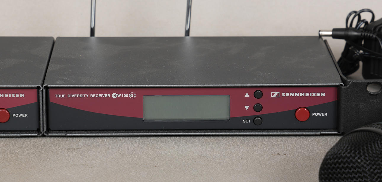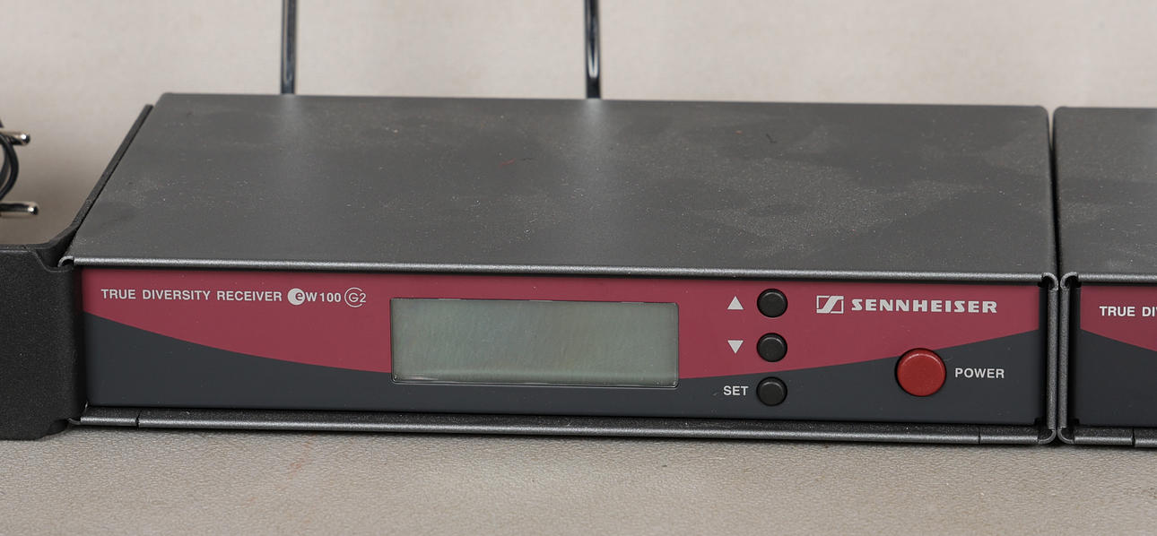 The Sennheiser EW100 G2 Microphone Receivers, connected on a rack mount, each with power cables, together with two Sennheiser EW100 G2 Microphones, combined unit measures 48.5cm x 15cm x 4.5cm. (4).