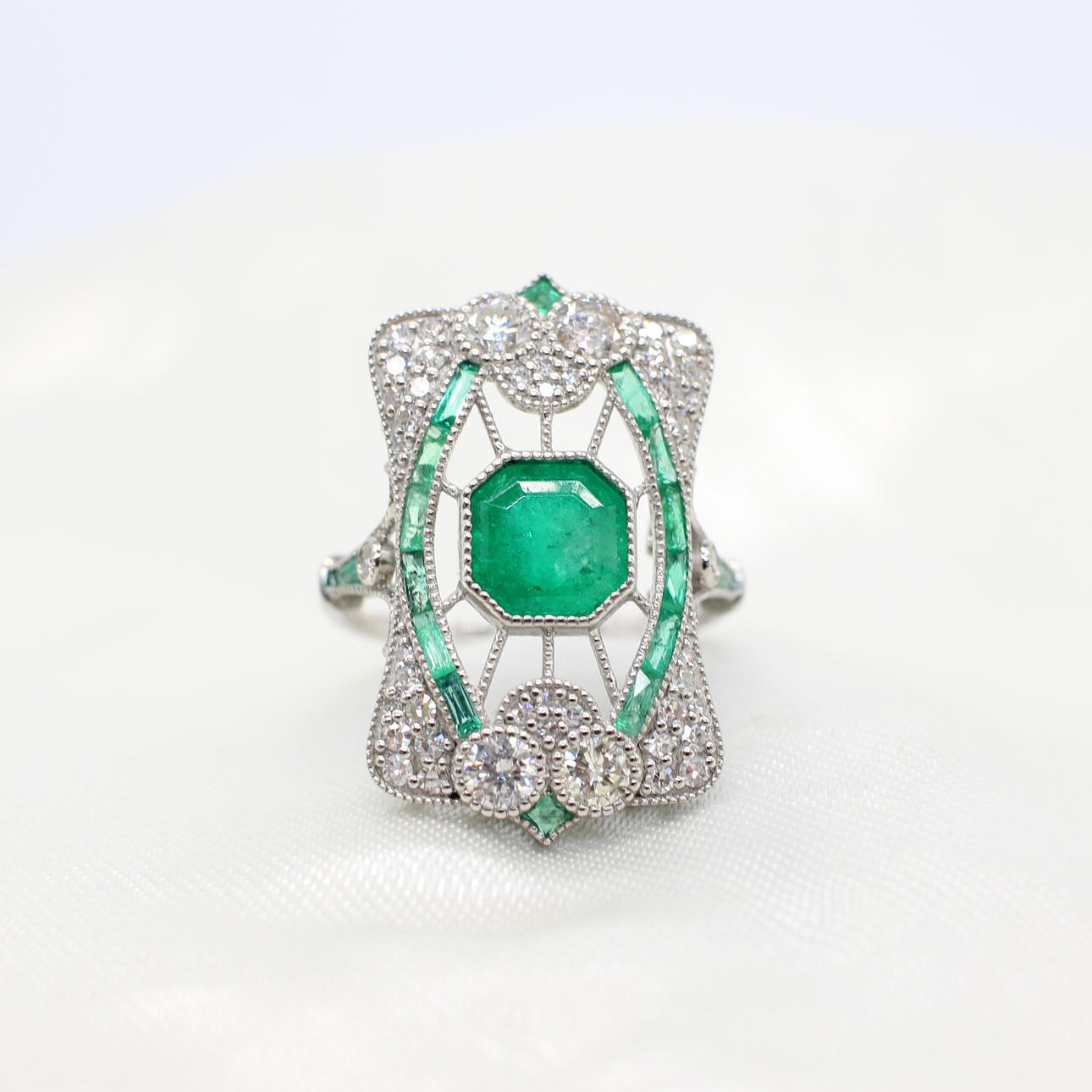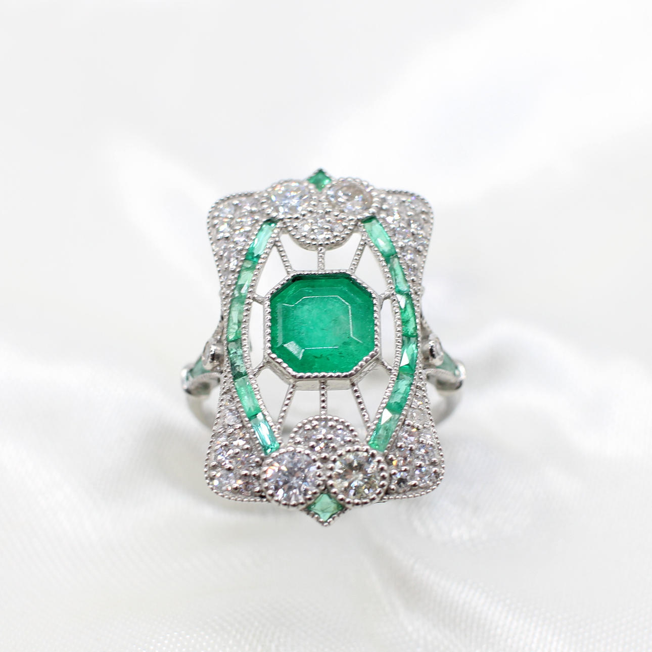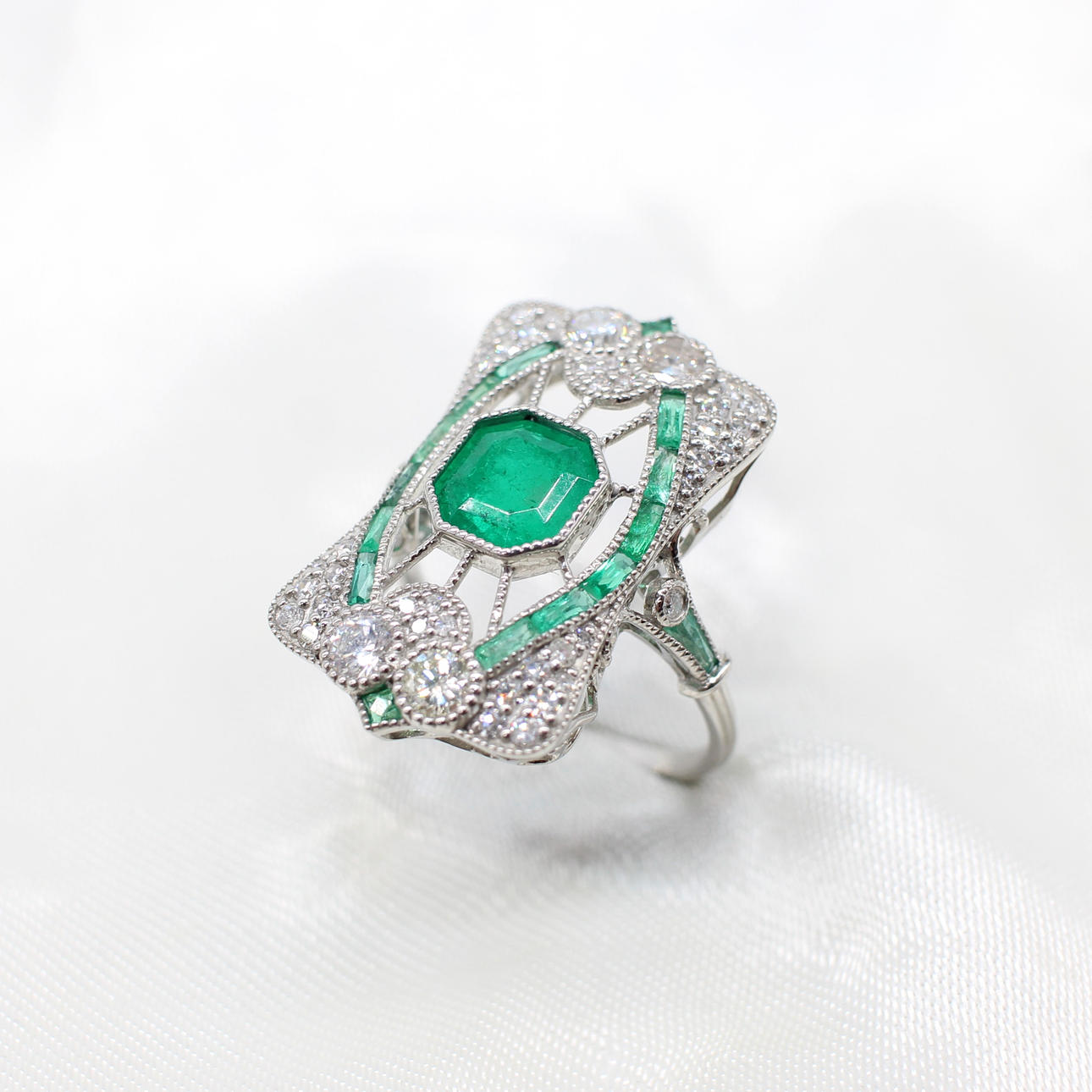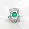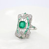 A stunning platinum (stamped PT950) art deco style emerald and diamond panel ring.