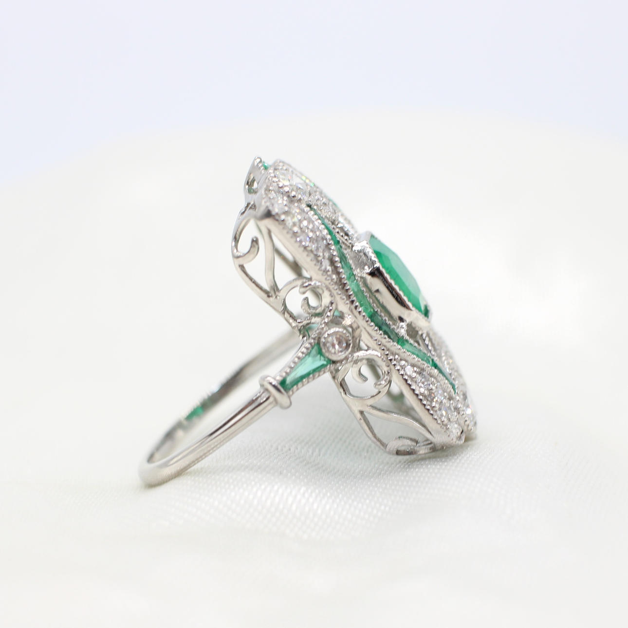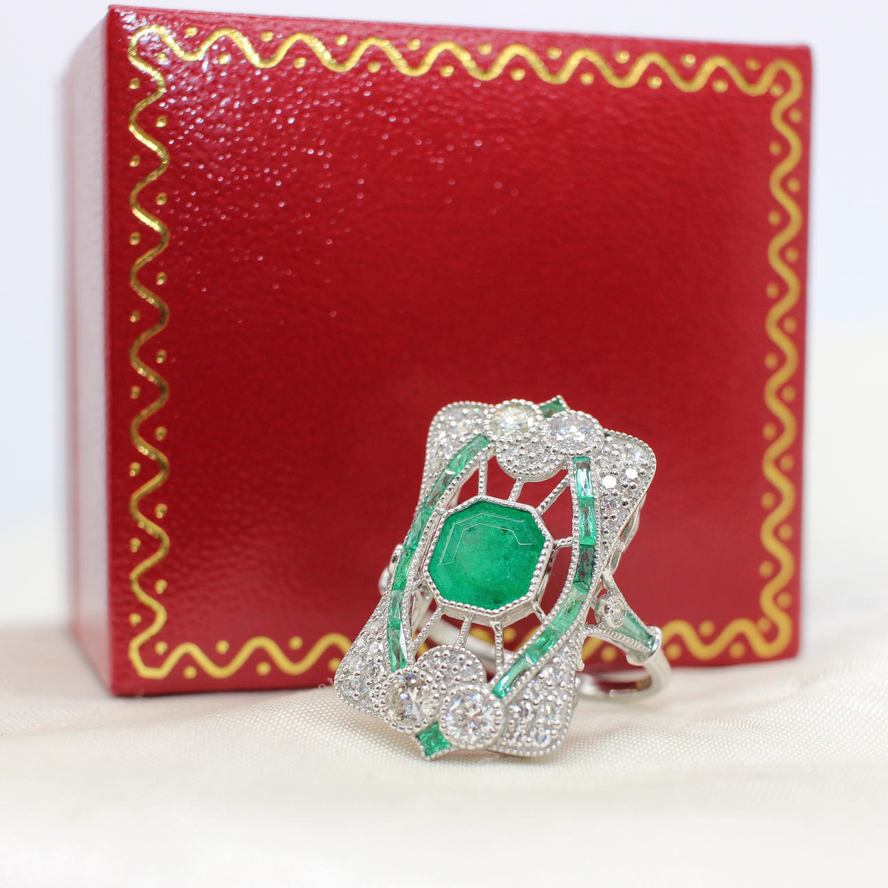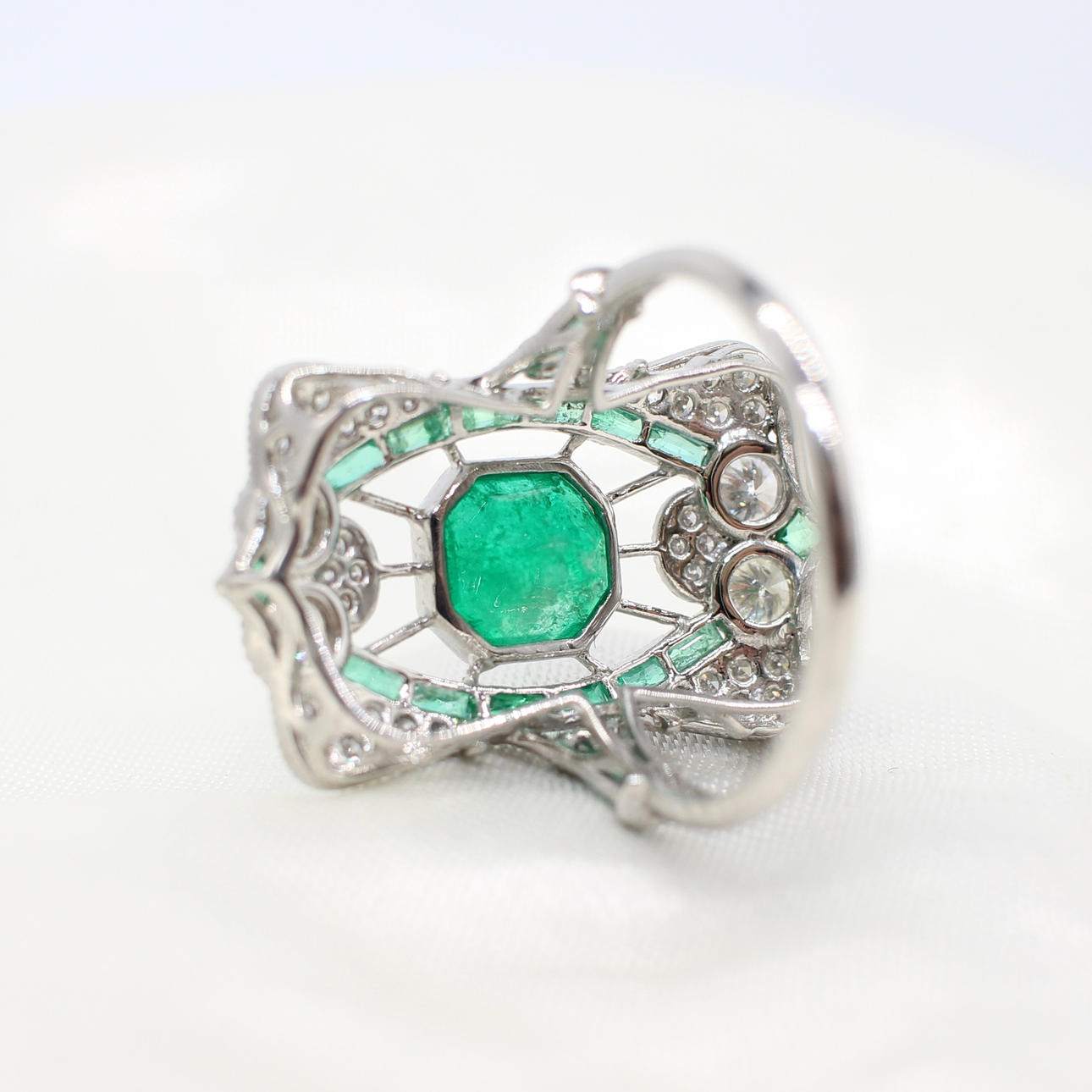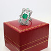 A stunning platinum (stamped PT950) art deco style emerald and diamond panel ring.