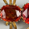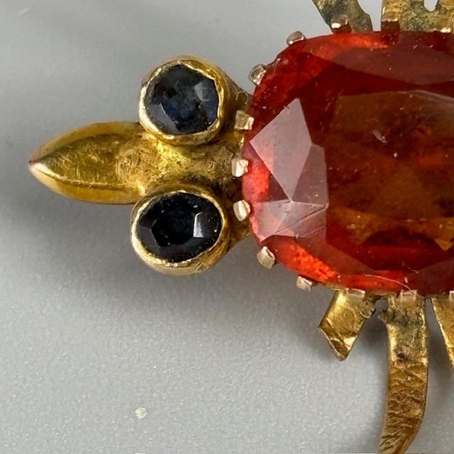 Antique unmarked yellow metal bug set with two orange gem stones and two blue gem stones for the eyes, approximately 3.4 cm long, total of 6.2g.