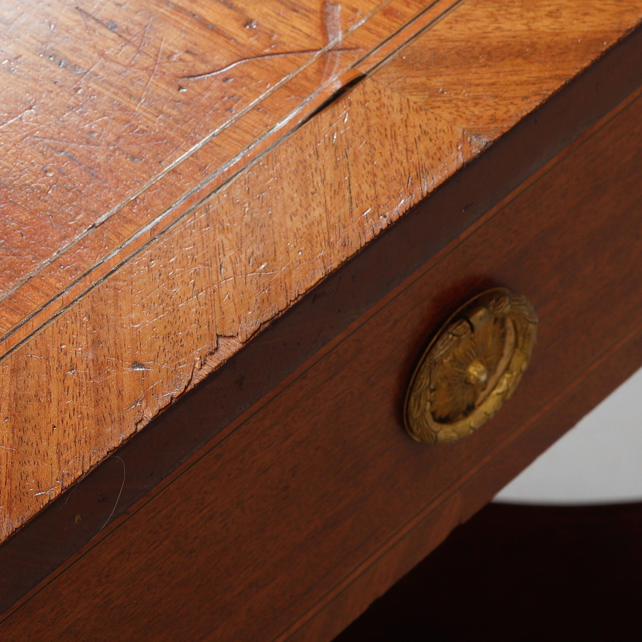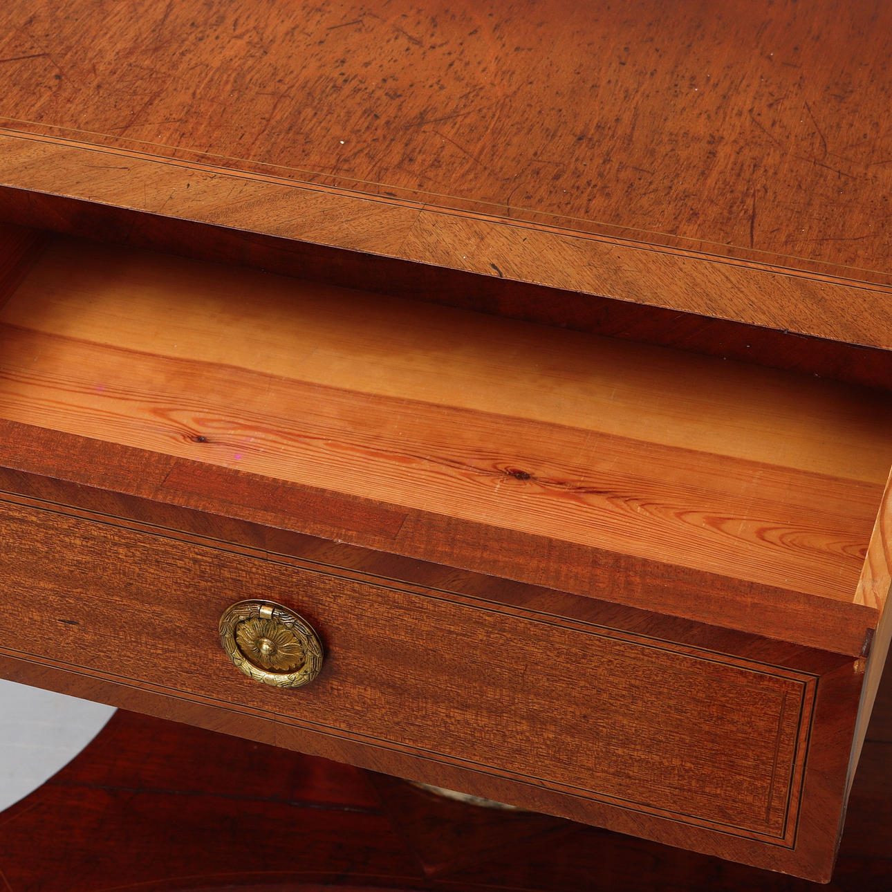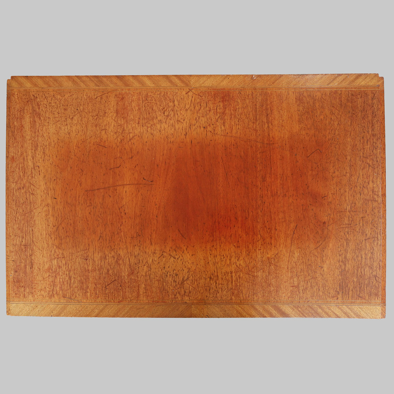 Mahogany. Intarsia decor. Boxes in sarg. Column-shaped legs on four-fit foot with paw ends. Length 25x2 + 108, depth 78, height 75 cm.