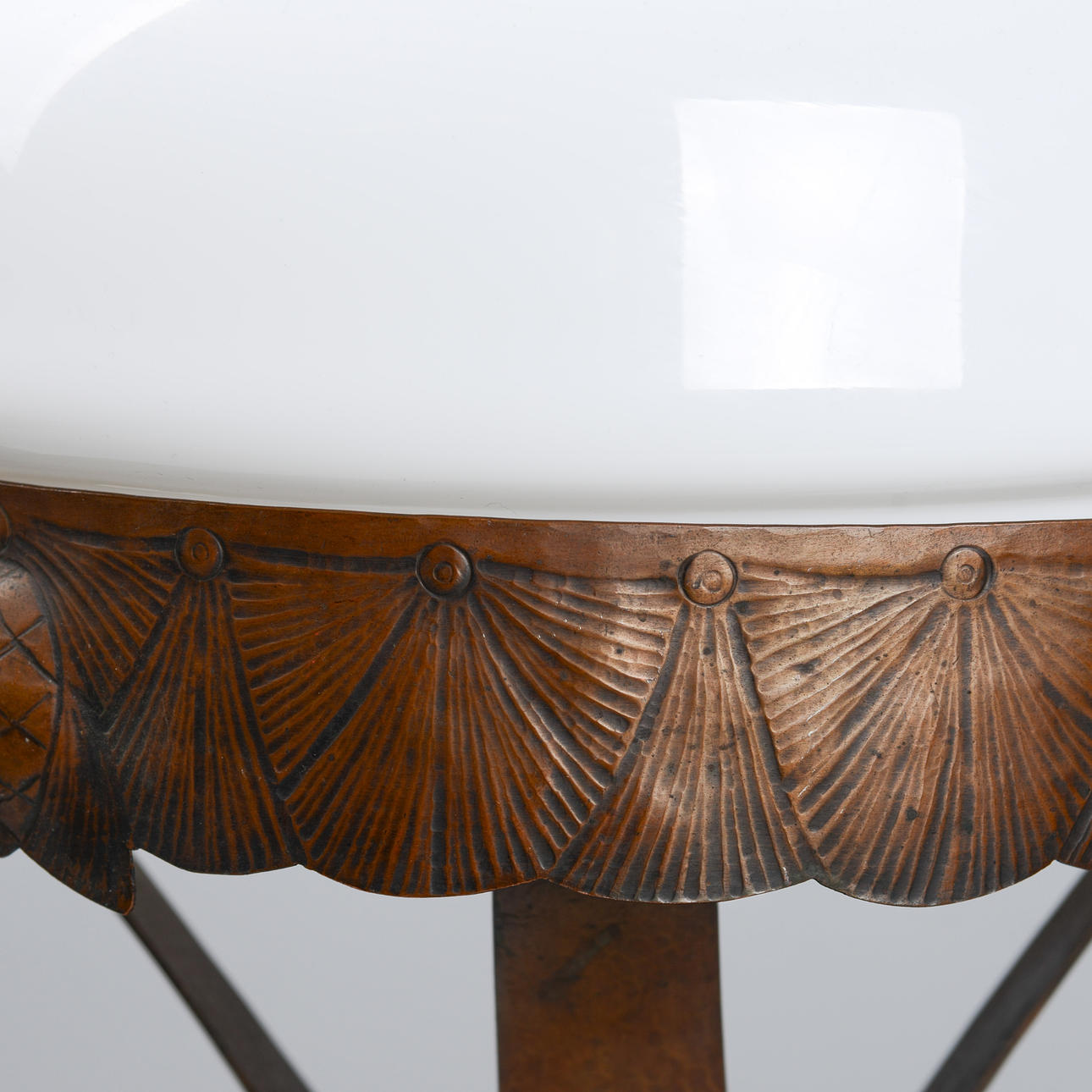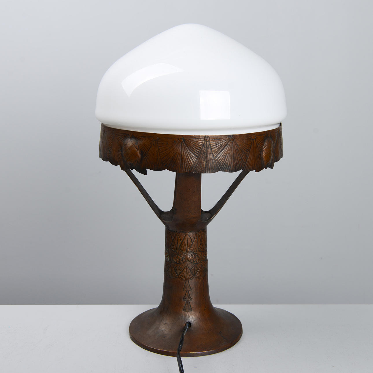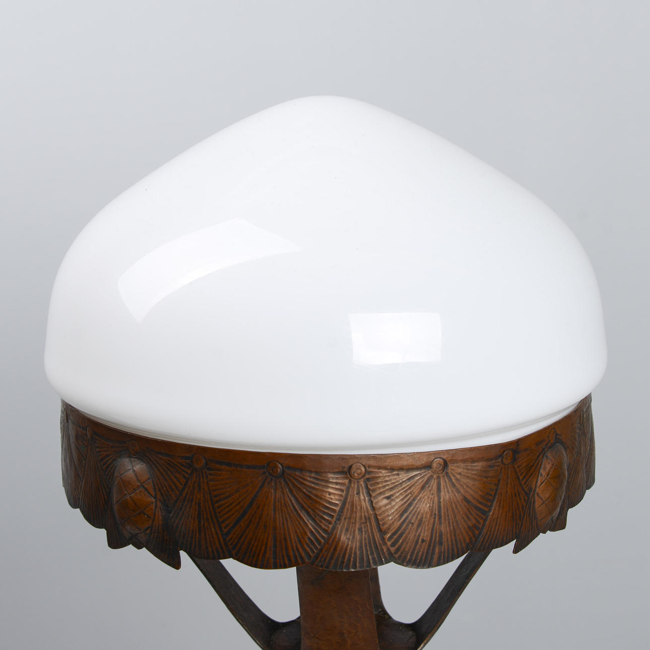 Copper frame with relief decoration of pine cones. Opal glass shade. Height 48 cm. Diameter 25 cm.