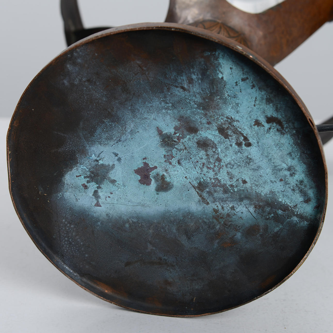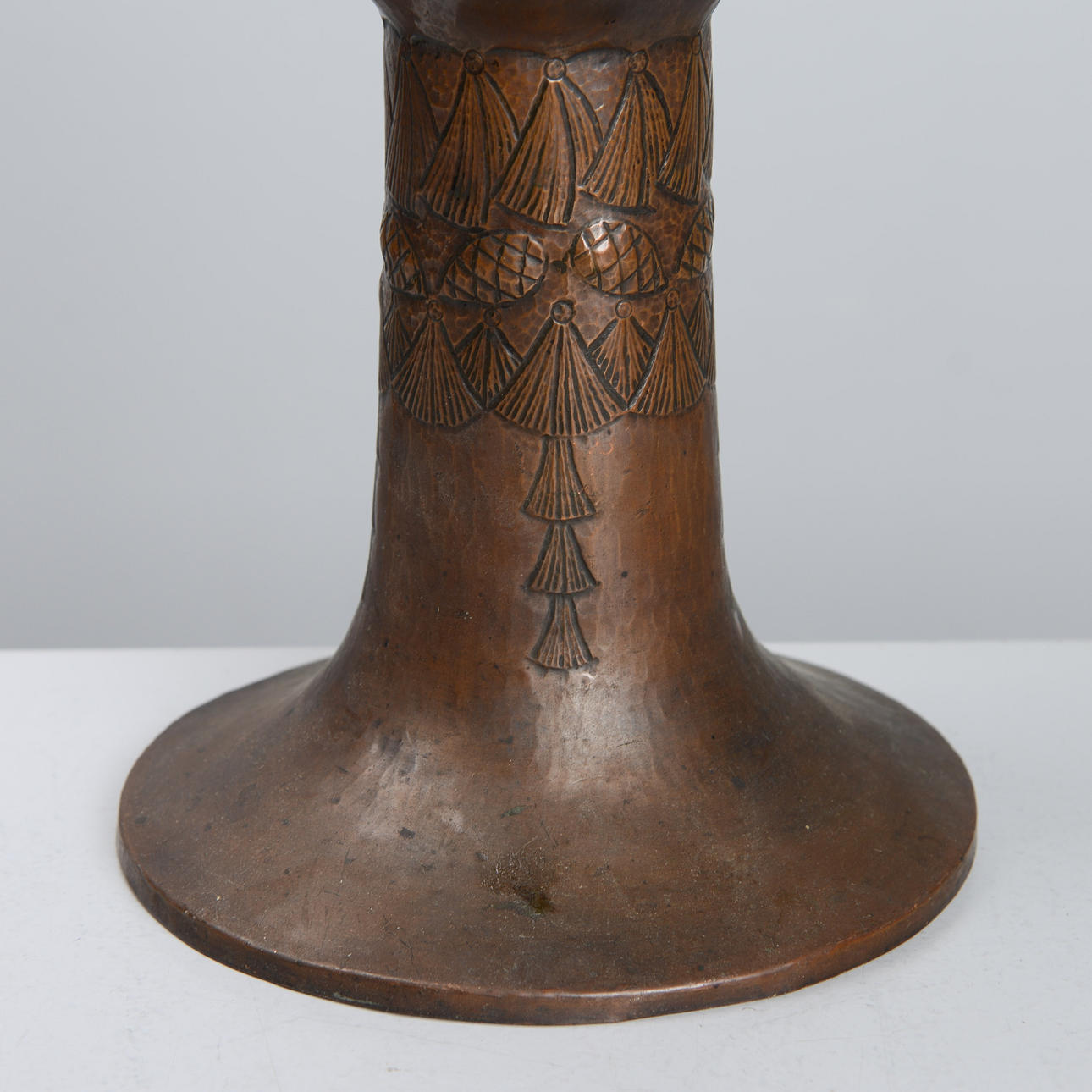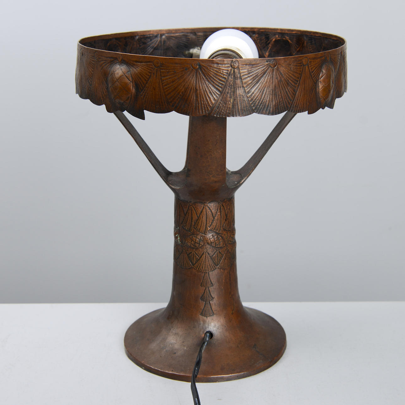Copper frame with relief decoration of pine cones. Opal glass shade. Height 48 cm. Diameter 25 cm.