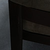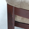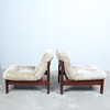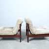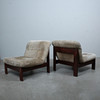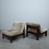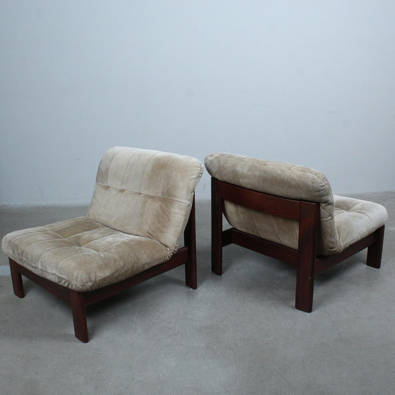 A pair of armchairs with a dark glazed wood frame with loose seat and back cushions covered with suede.