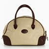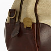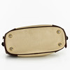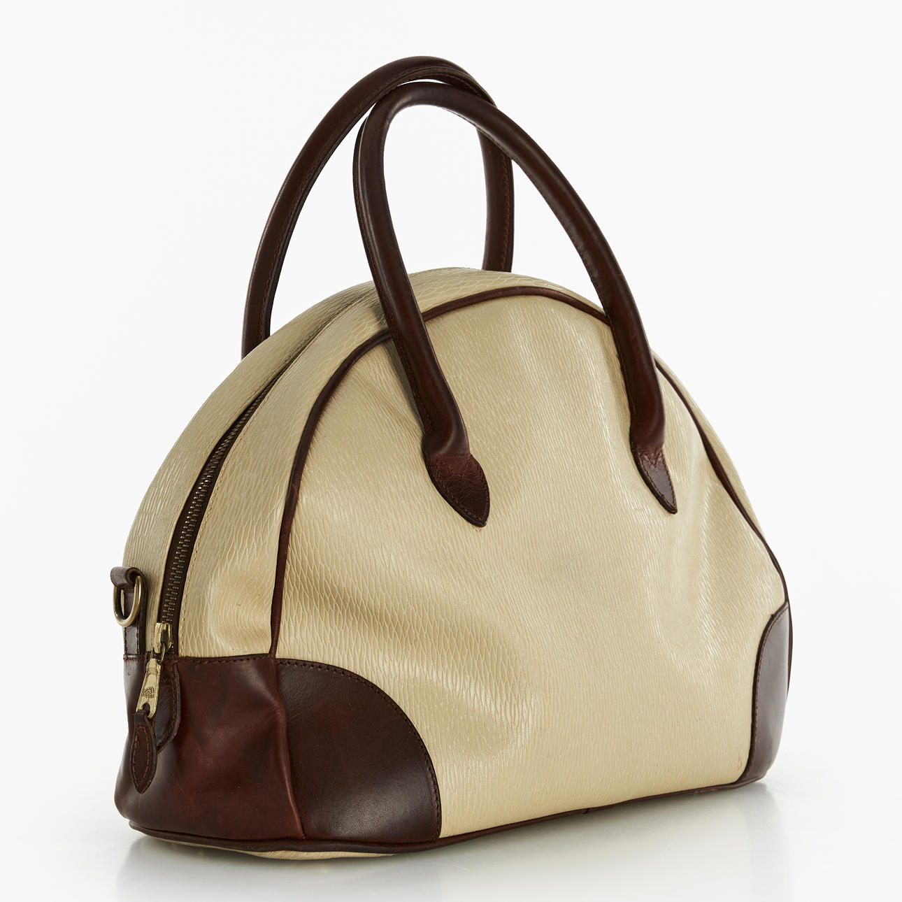 Embossed white leather with brown leather details. Interior textile lined, inner compartment with zipper. Tagged “Made in Turkey”.