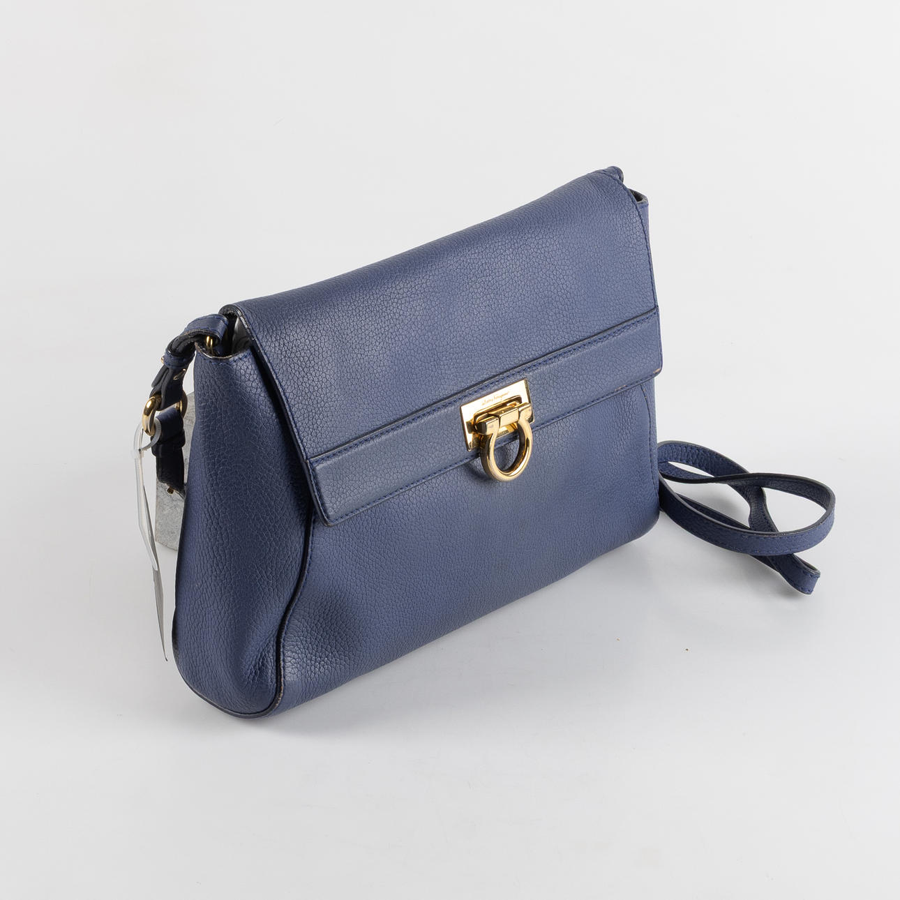 in blue leather with gold-plated metal hardware. Marked Salvatore Ferragamo, MADE IN ITALY AU-21 /D731. Approx. 27 x 16 x 6 cm.