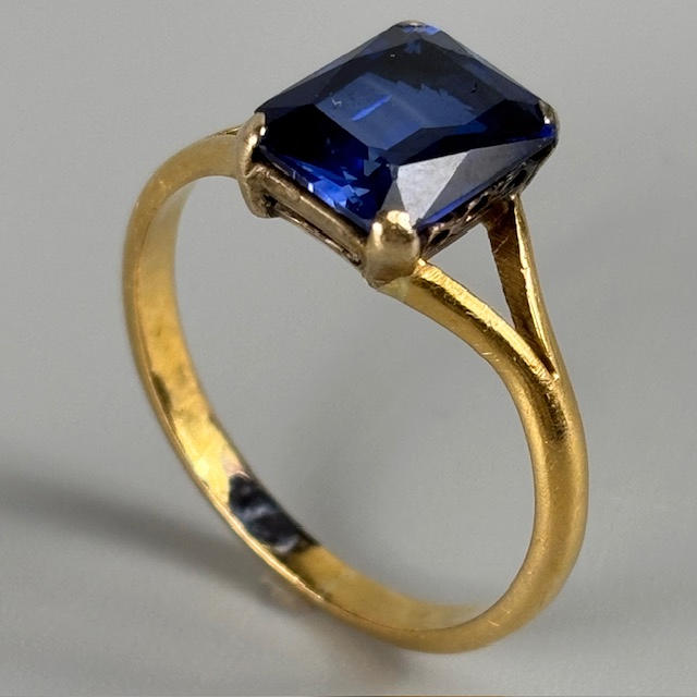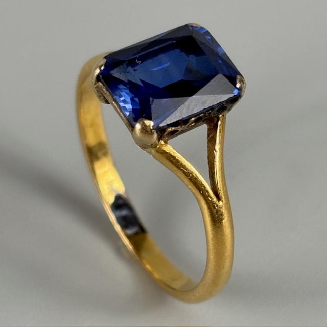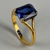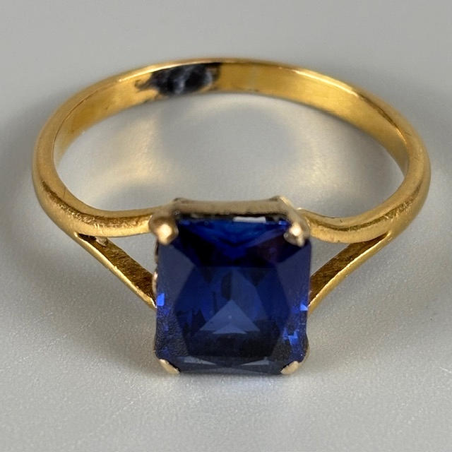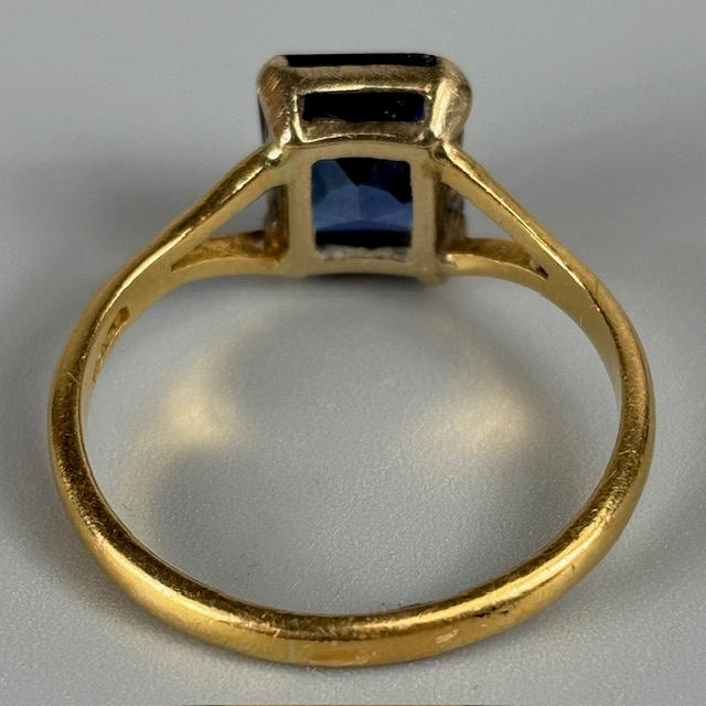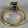 Yellow metal blue cushion cut stone set ring, size T, approximately 4.1g total.