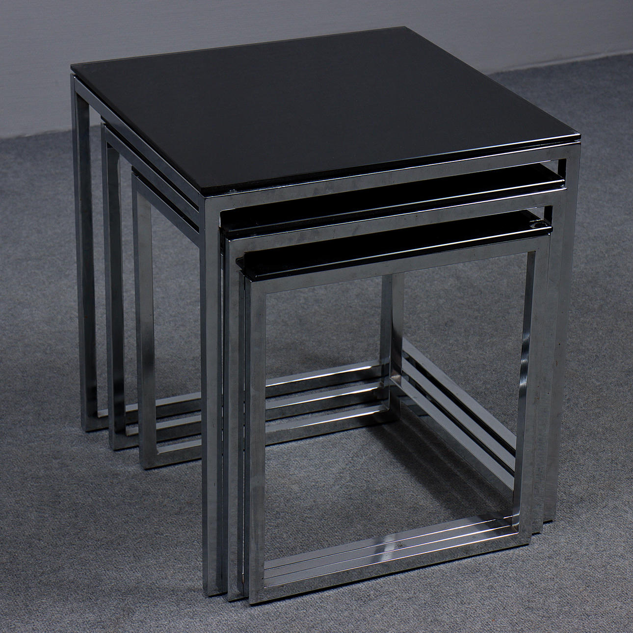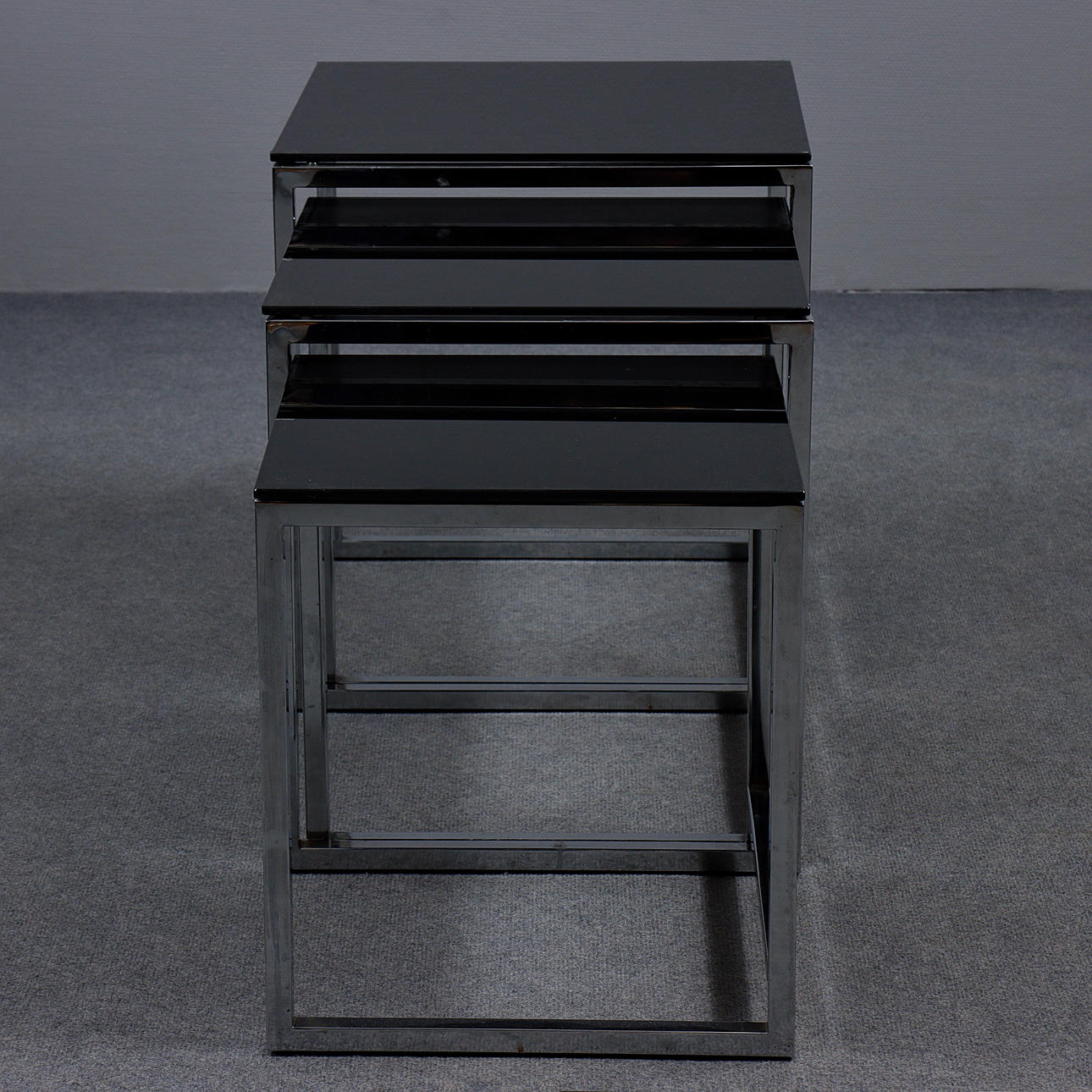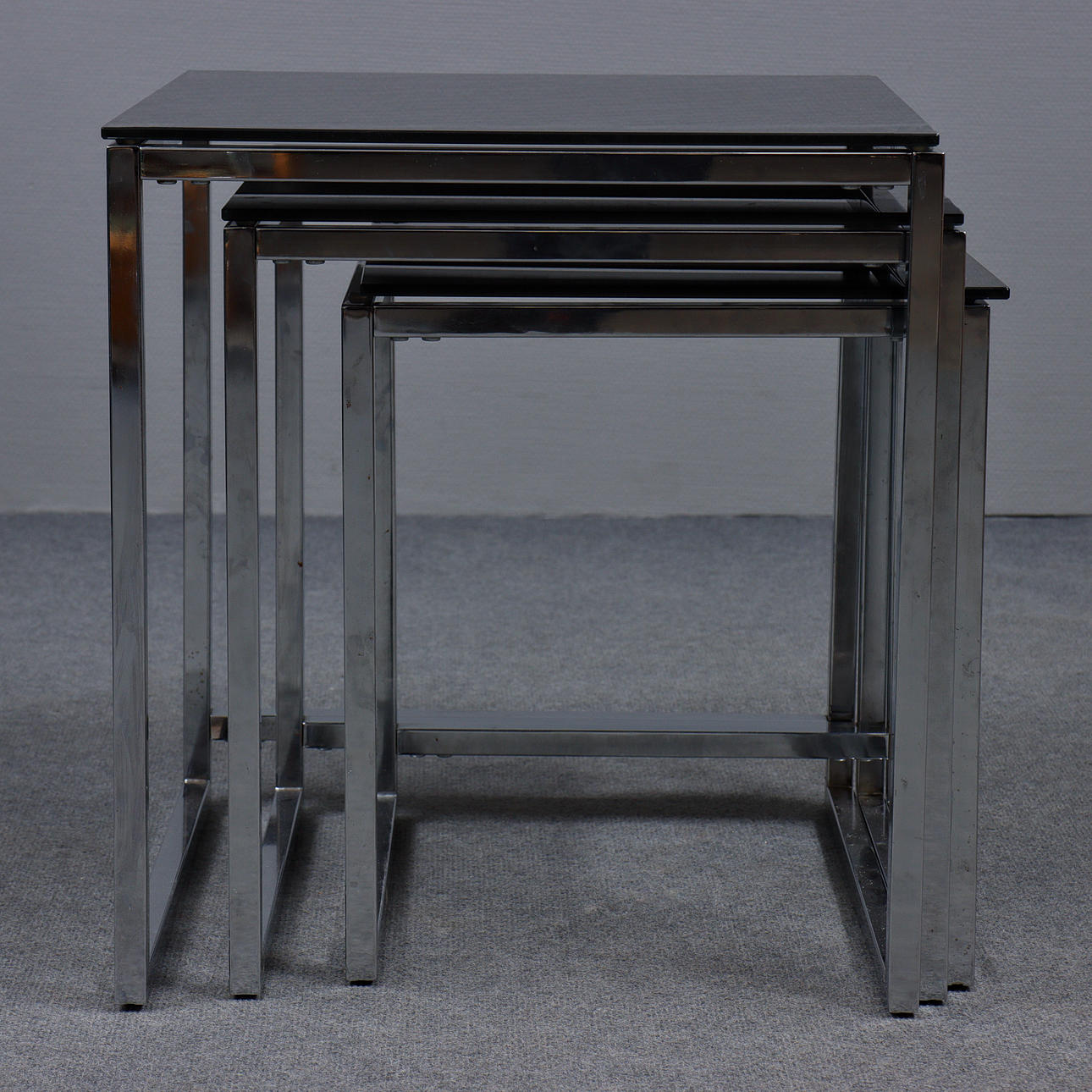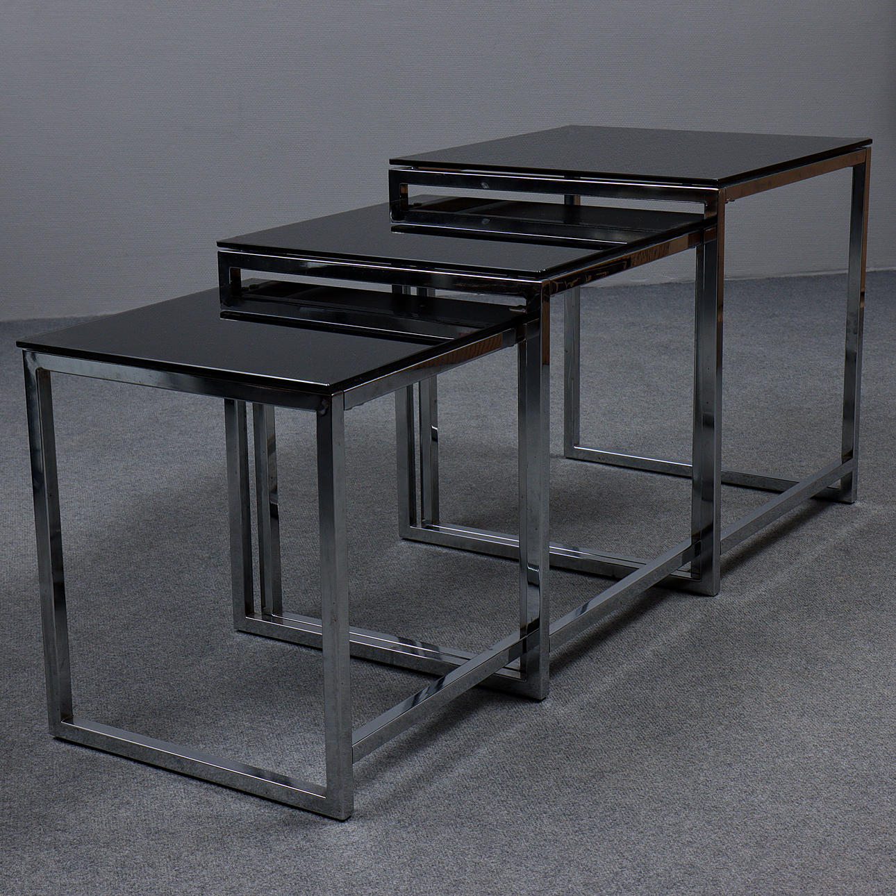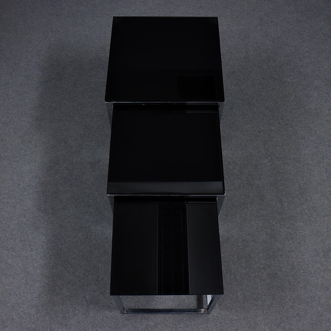 NESTING TABLES, CHROME, BLACK TINTED GLASS, CONTEMPORARY.