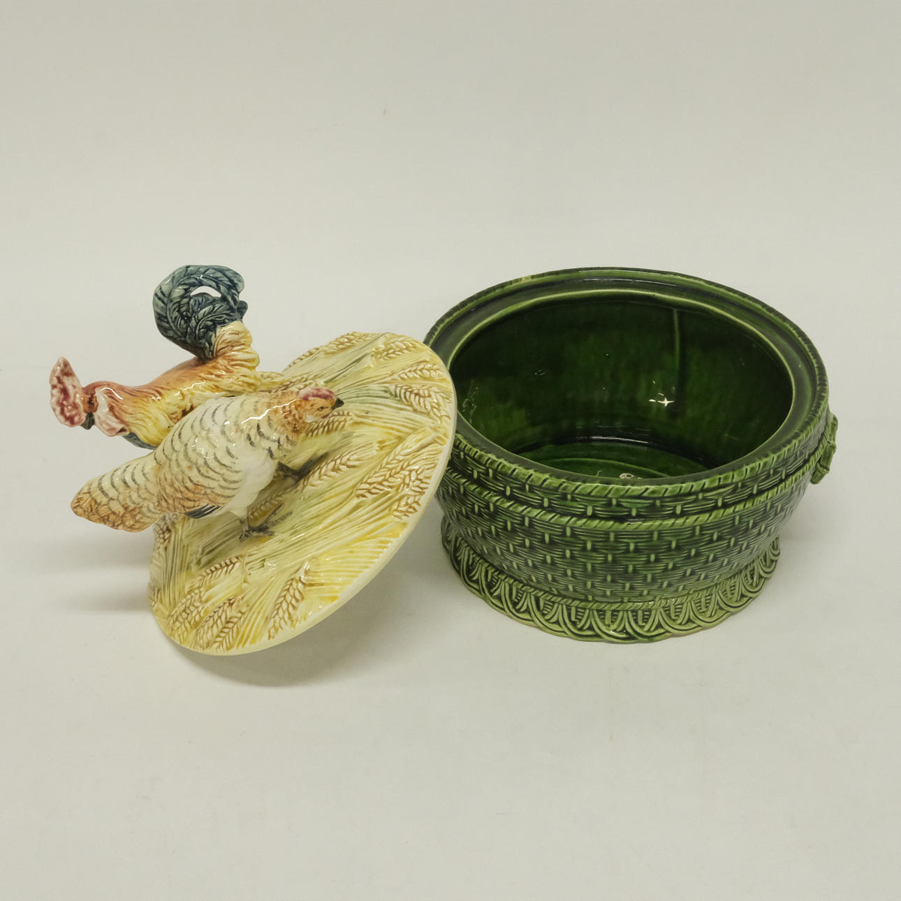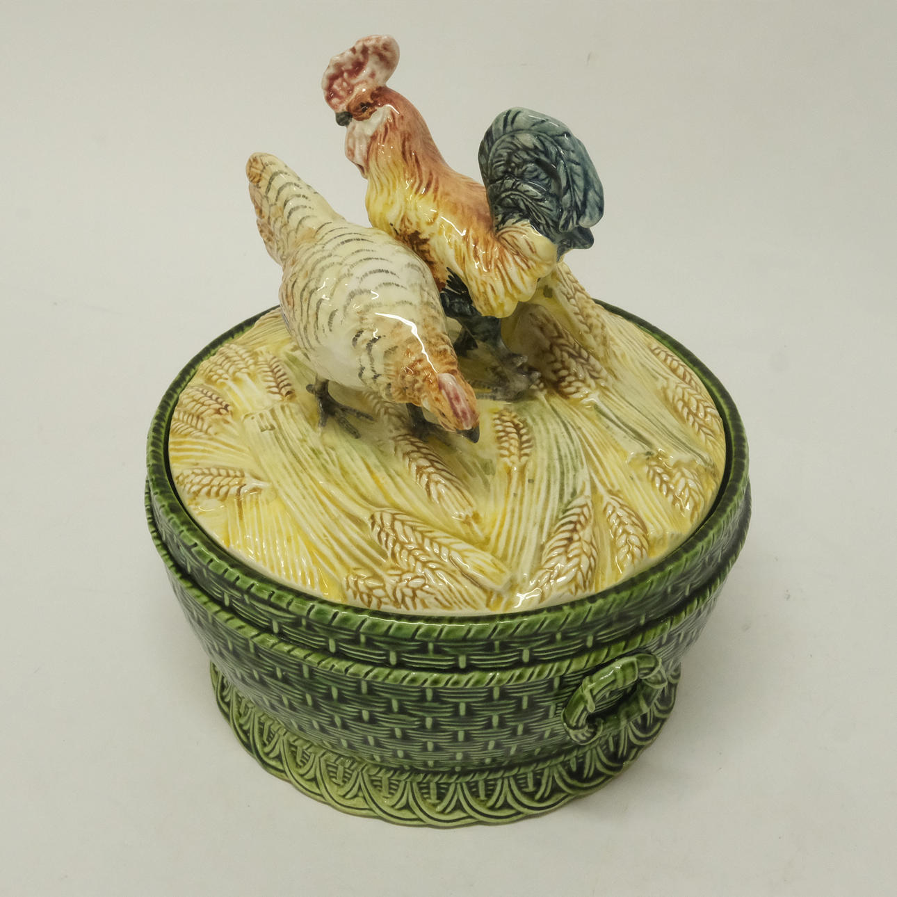 Czech Republic, bowl, height 12 cm, diameter 22 cm, lid with decoration of rooster and hen, total height 26 cm.