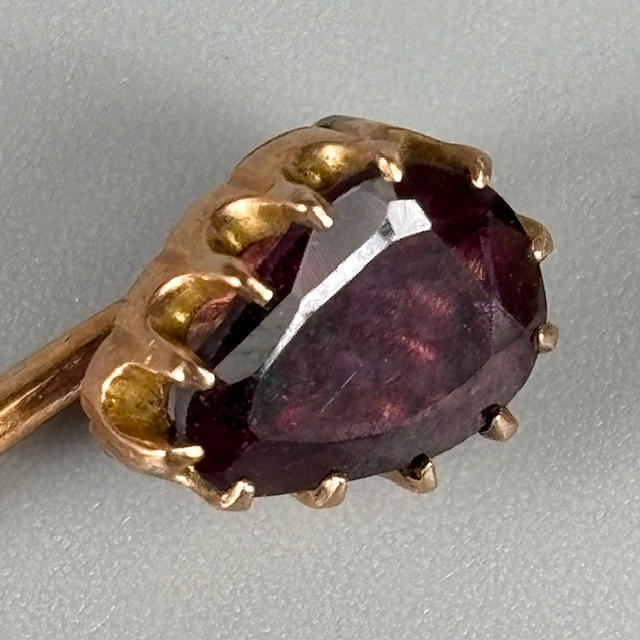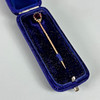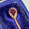 Antique yellow metal stick pin set with a red teardrop stone, in a fitted case.