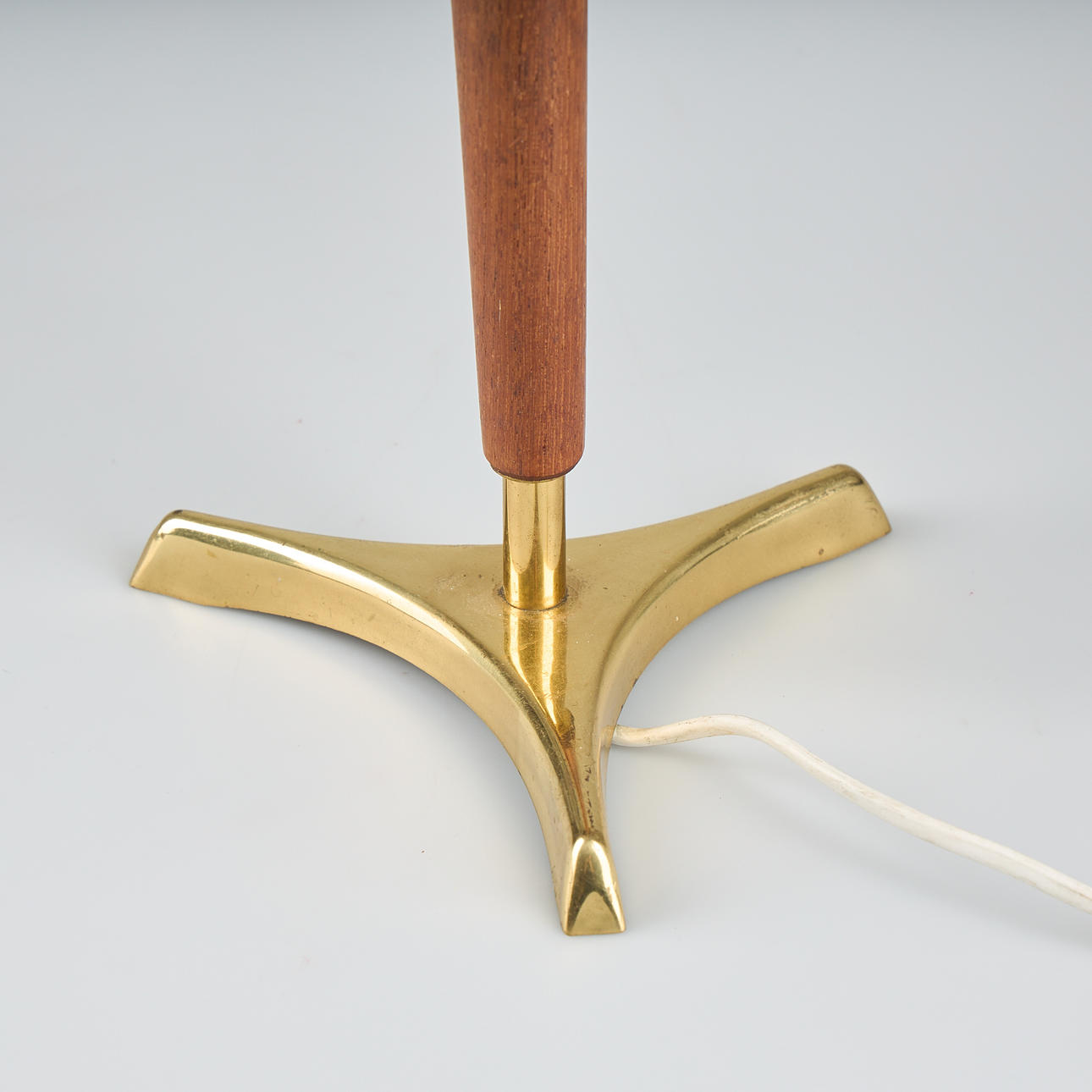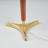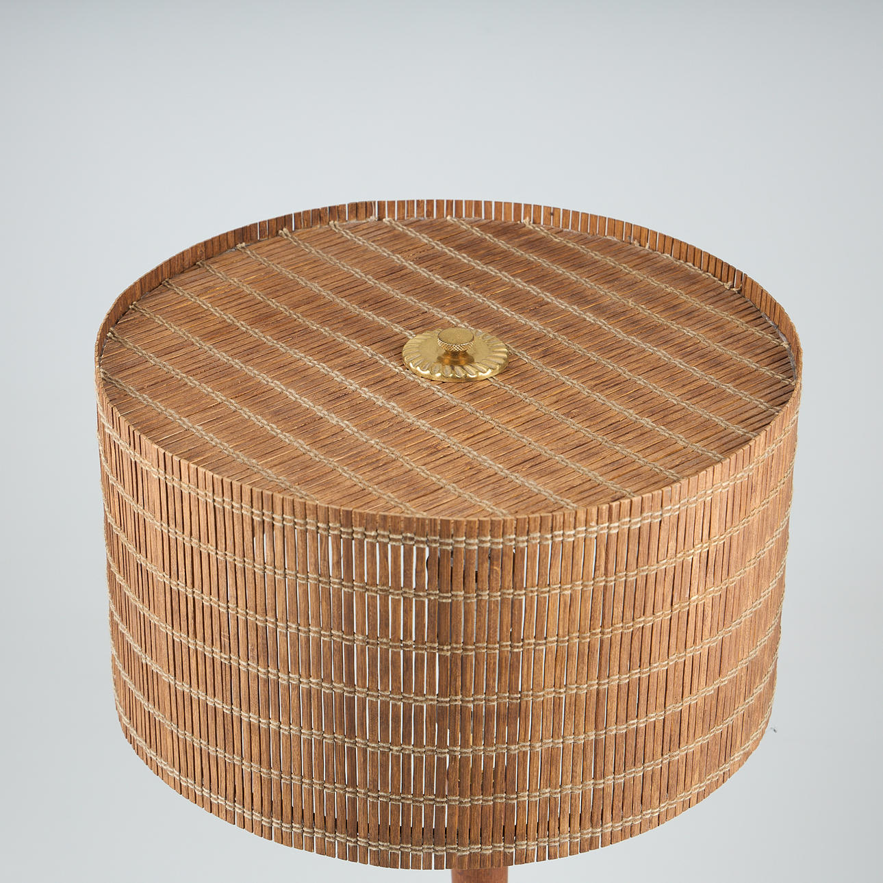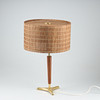 Polished brass and wooden details. Lampshade with slats. Height 27-47 cm, diameter 31 cm.