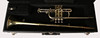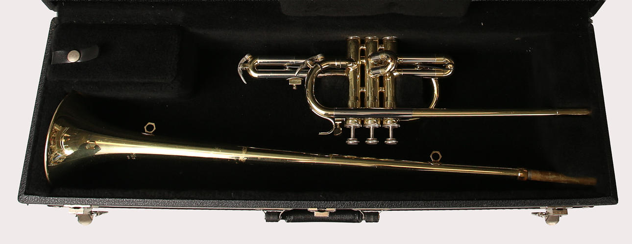 Brass trumpet with attached case.