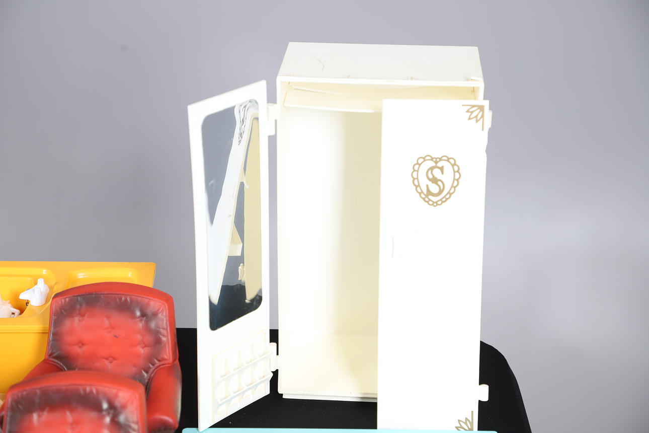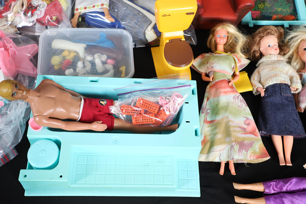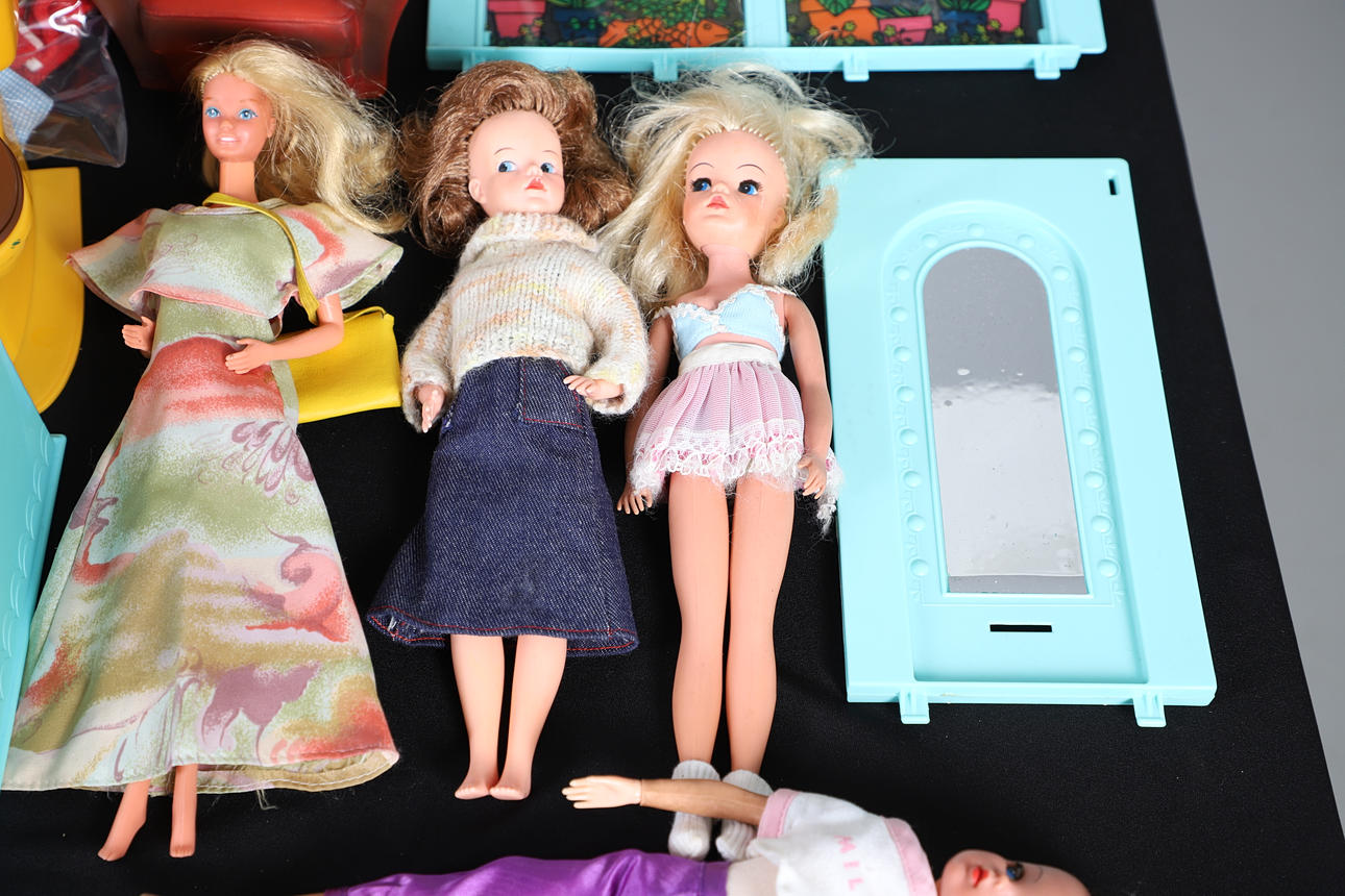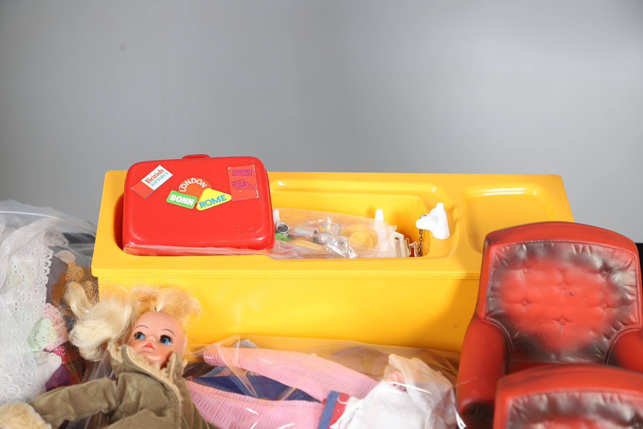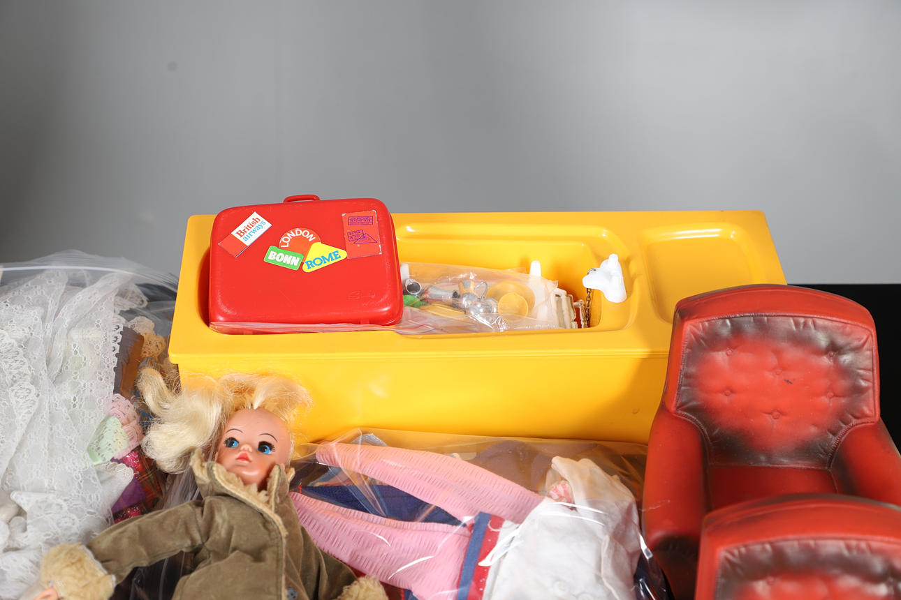 To including house furniture, a large assortment of clothing, various dolls etc. box W40 x H22 x D33cm (qty).