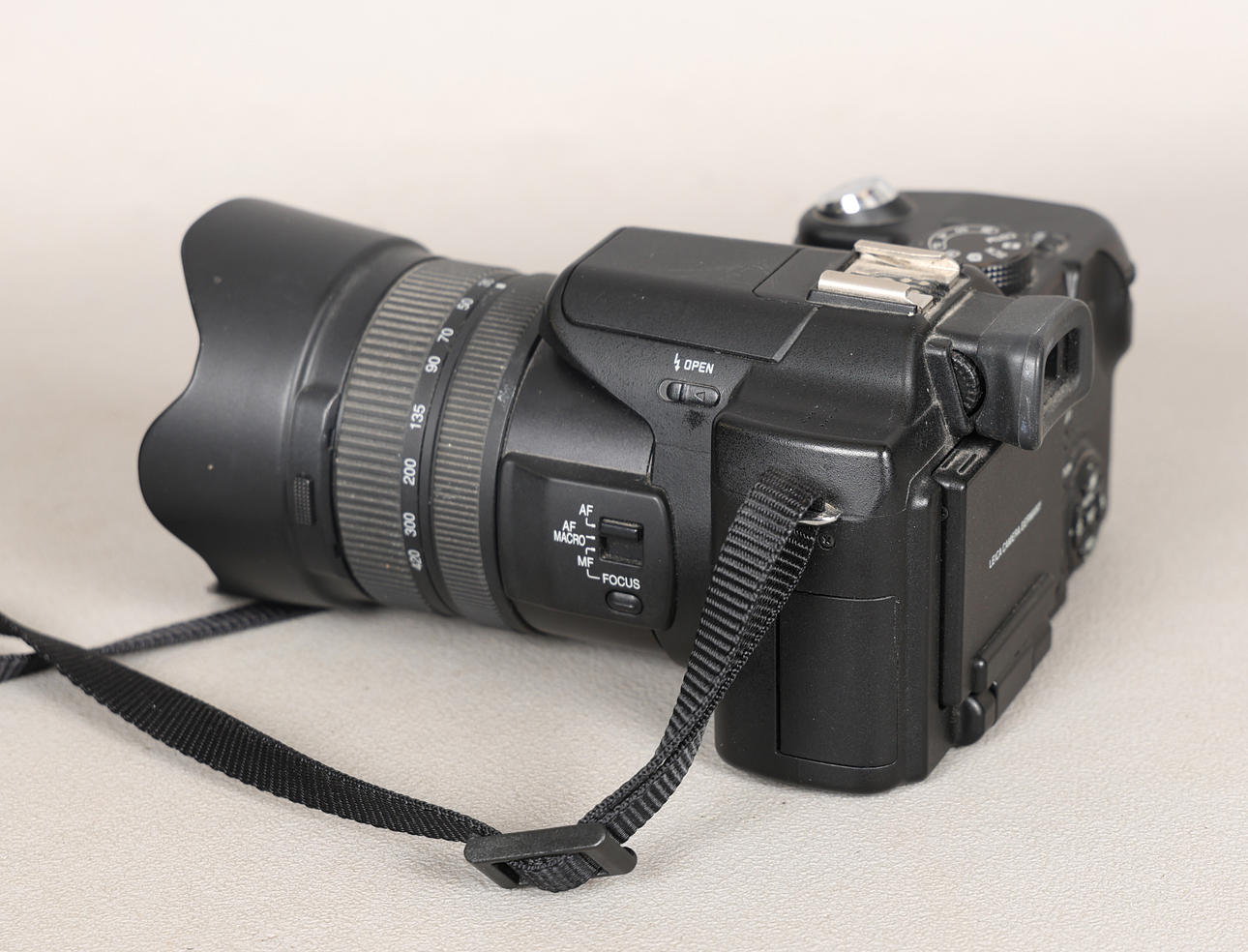The Leica V-Lux 1 digital camera with DC Vario-Elmarit 1:2.8-3.7 lens, with hood and strap, serial number 3138434, measuring 18cm x 13cm x 8.5cm.