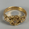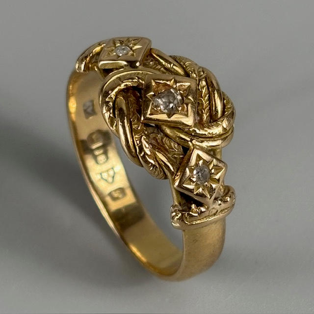 Antique 18ct gold fully hallmarked diamond set ring in a stylised gypsy knot setting approximately 6.2g ,size U, Chester 1915.