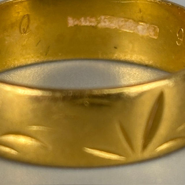 22ct gold hallmarked wedding band with engraved decoration, approximately 4.5g, size Q.