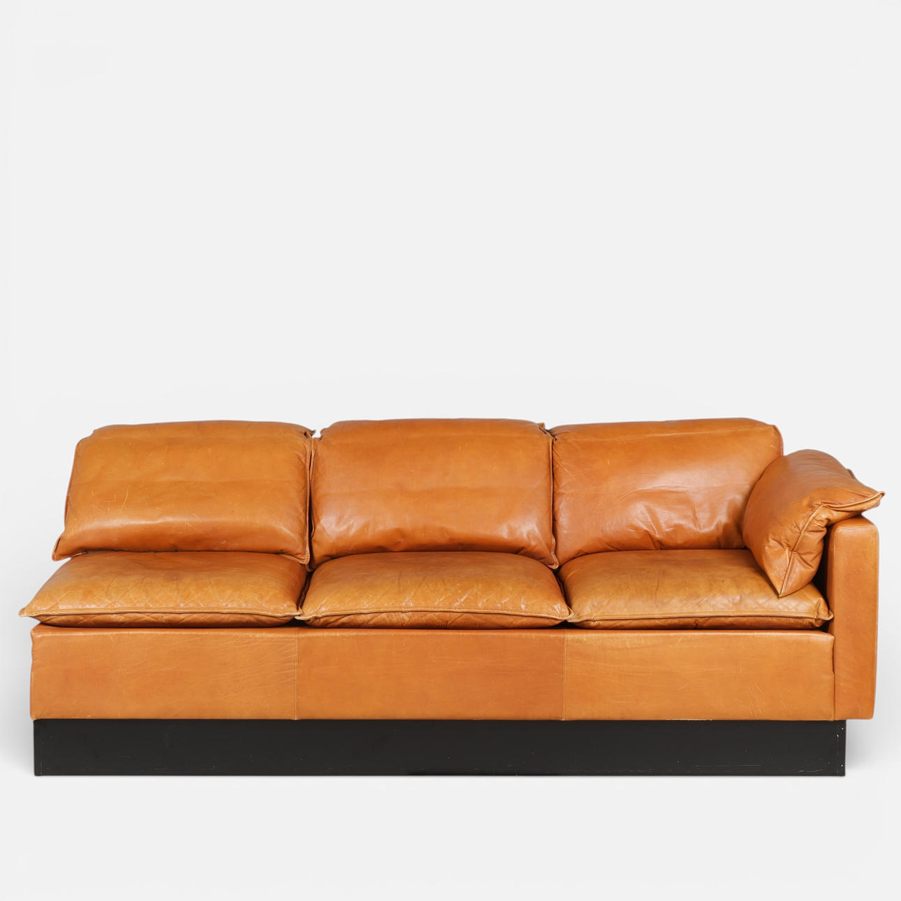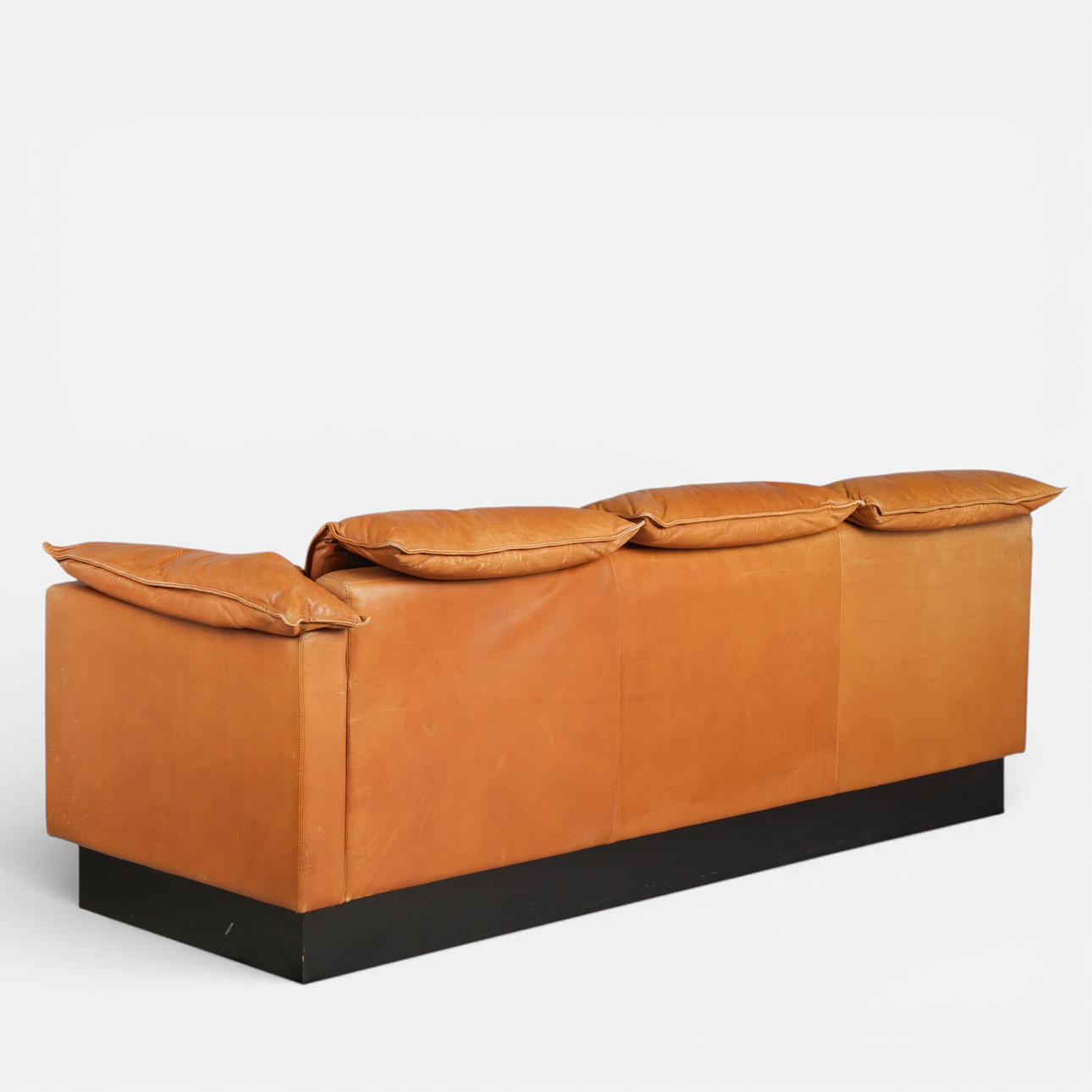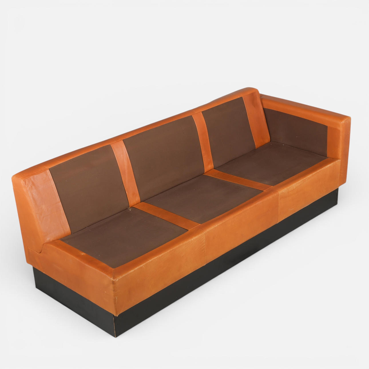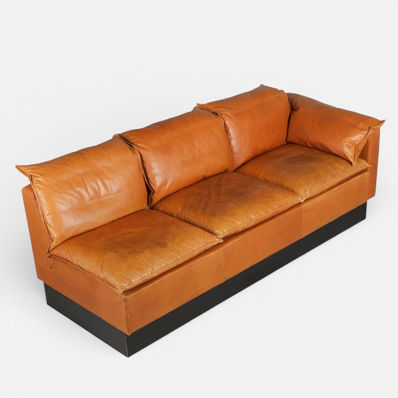 Danish design. Three pers. sofa with cognac colored leather on black wood plinth.