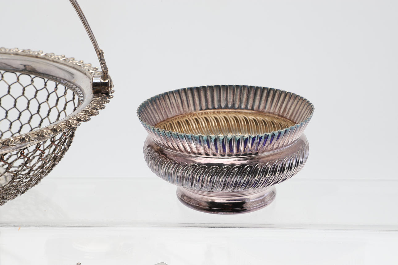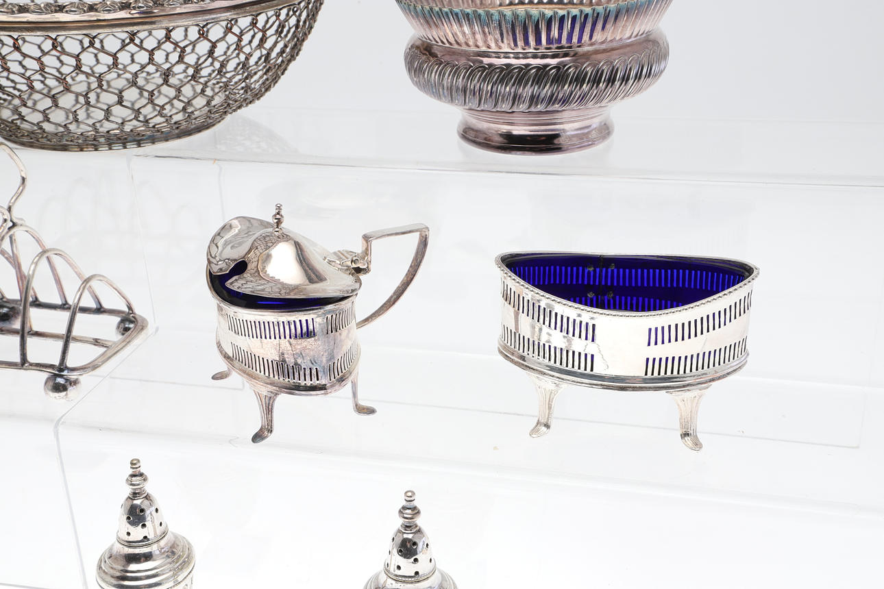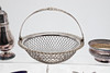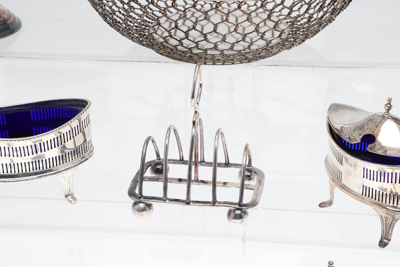 To include a swing handled basket (Diameter 23cm), a sugar shaker (Height 19cm), a toast rack, various condiments and other silver plated items. Please see online images.