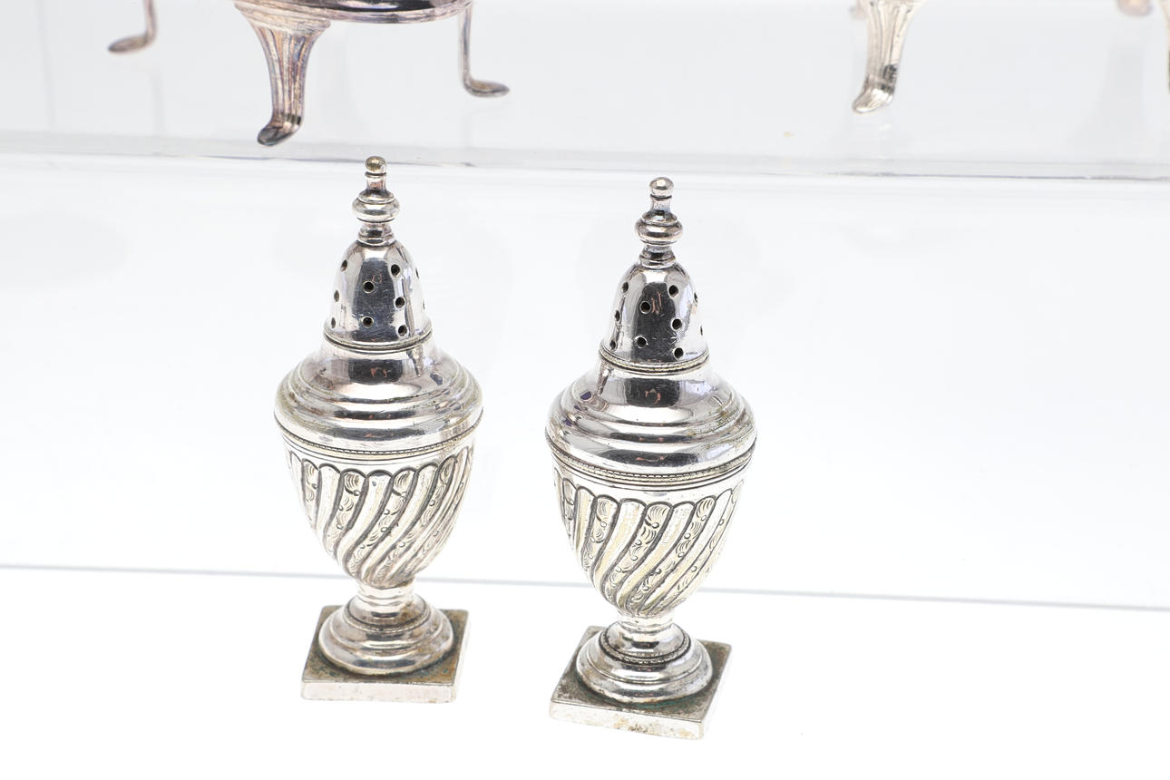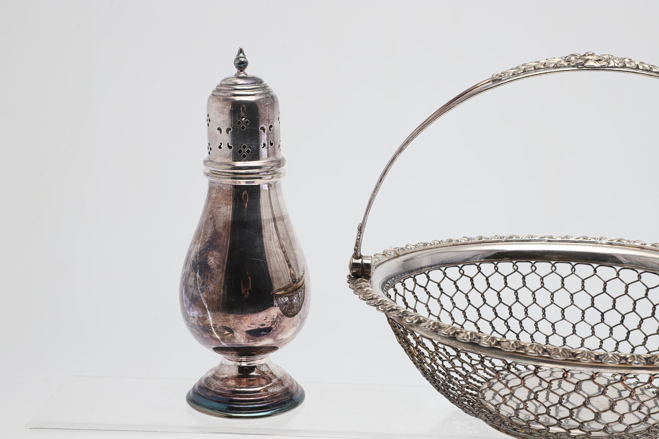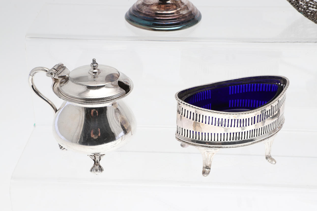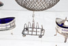 To include a swing handled basket (Diameter 23cm), a sugar shaker (Height 19cm), a toast rack, various condiments and other silver plated items. Please see online images.