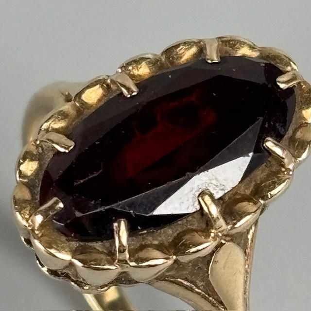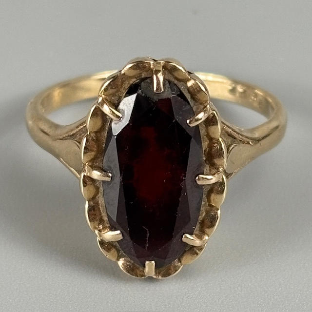 9ct gold marked ring set with an elongated oval cut garnet stone approximately 3.2g total, size N.