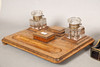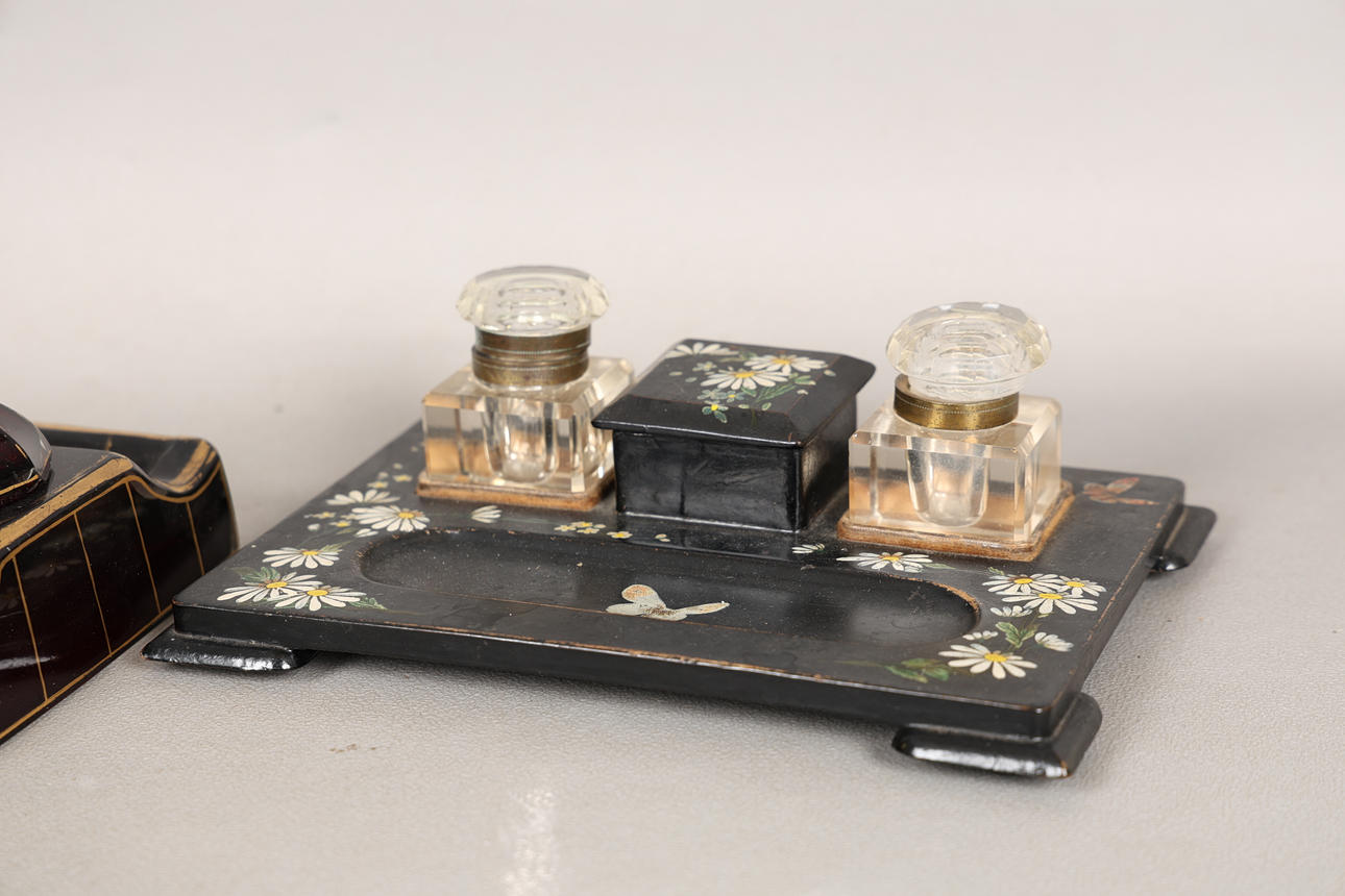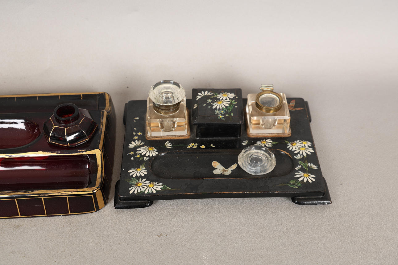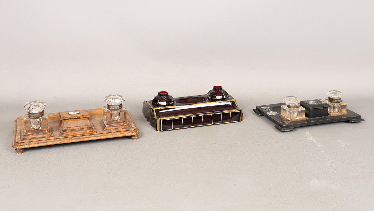 To include a red and gilt glass example with dished centre, two inkwells and two pen trays, 22cm wide, 15.5cm deep, 7cm high, a walnut example with two glass inkwells, stamp box with enamel decorated lid and pen tray, 27cm wide, 19cm deep, 10cm high, a papier mache example with two glass inkwells, lidded compartment and pen tray, 22cm wide, 16cm deep, 7cm high (3).