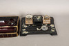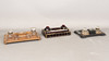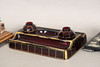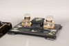 Red glass example with chip where one of the inkwells sits, the others with loose or damaged lids to the inkwells, surface scratches and marks.