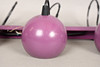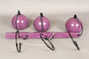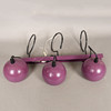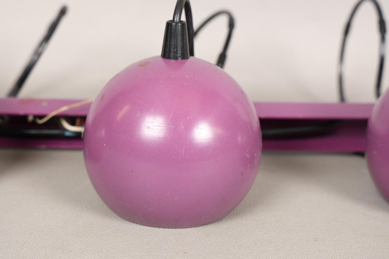 The set of three spherical purple metal ceiling spotlights, mounted together on a purple rail which measures 46cm across.