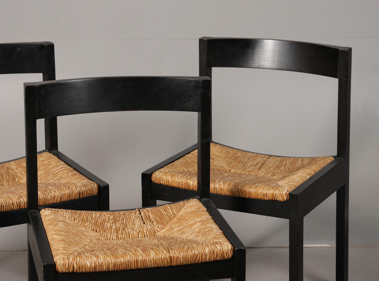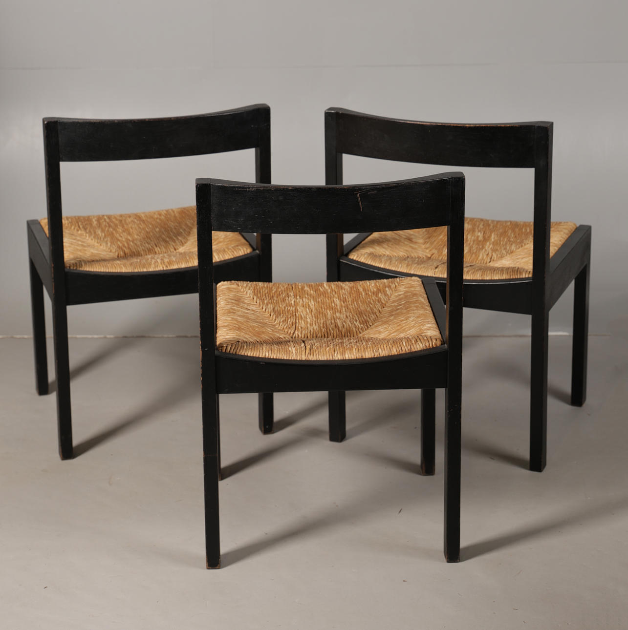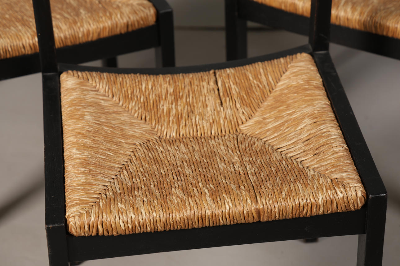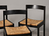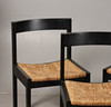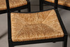 Having ebonised frames with rush seats, 76cm high 48cm wide, seat height 44cm high.