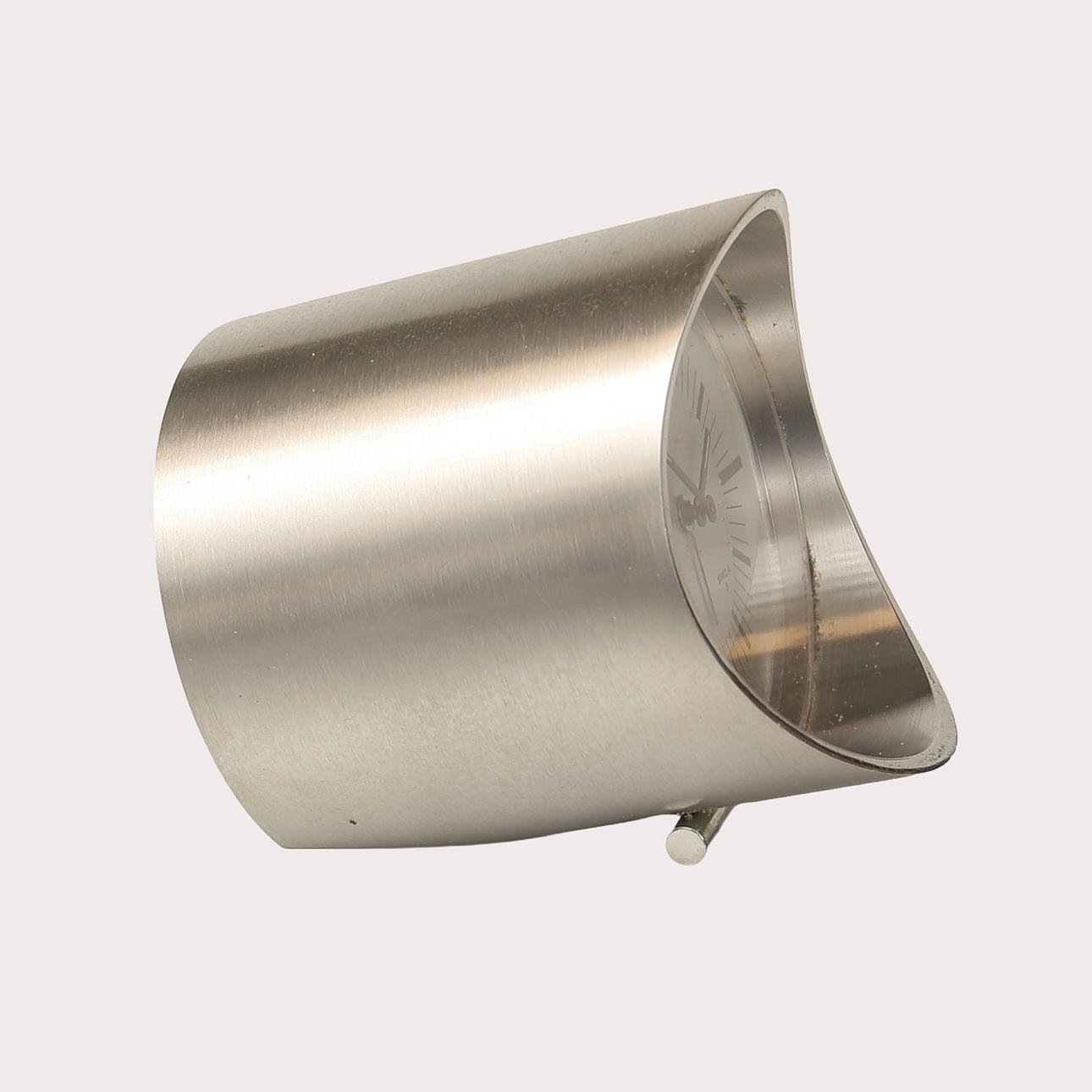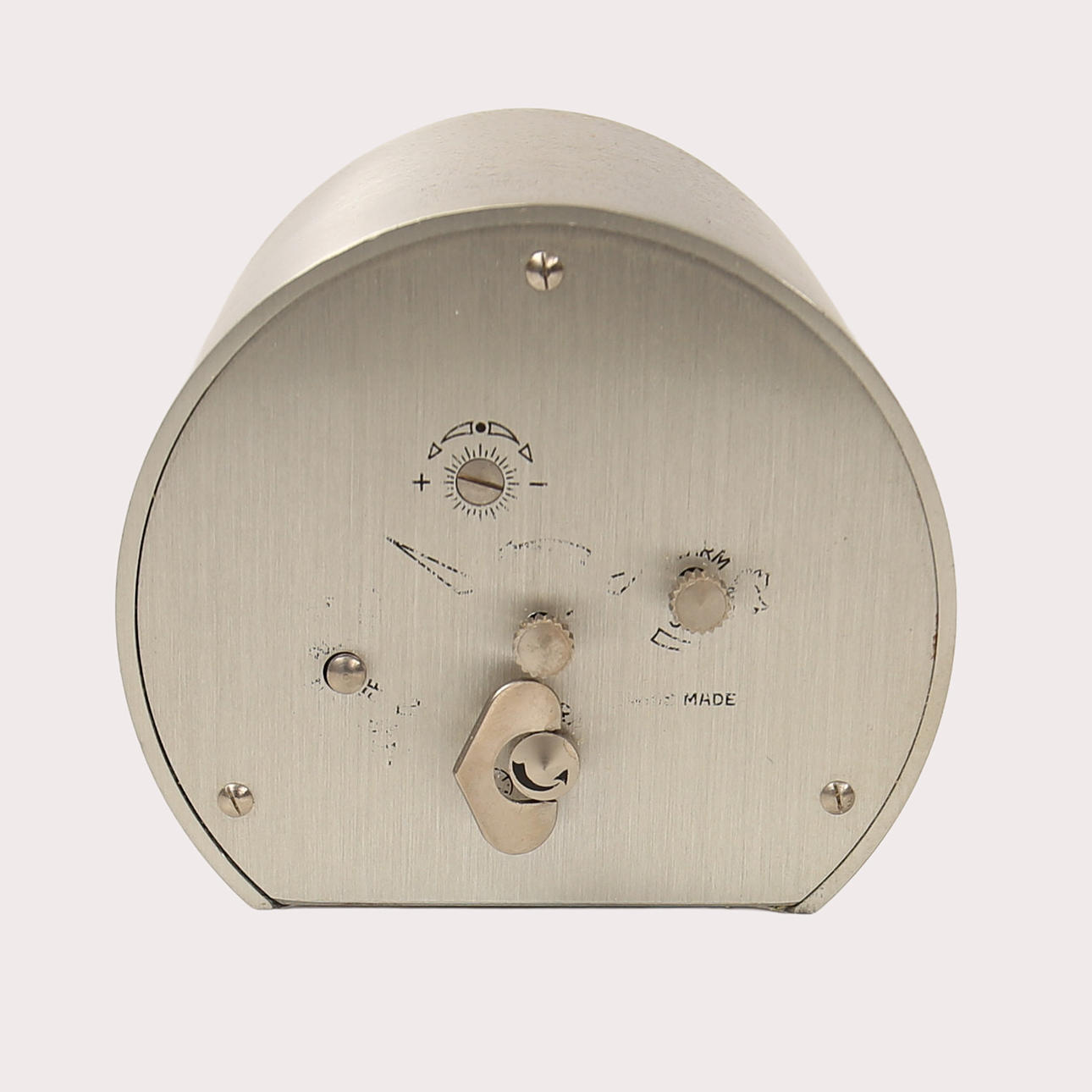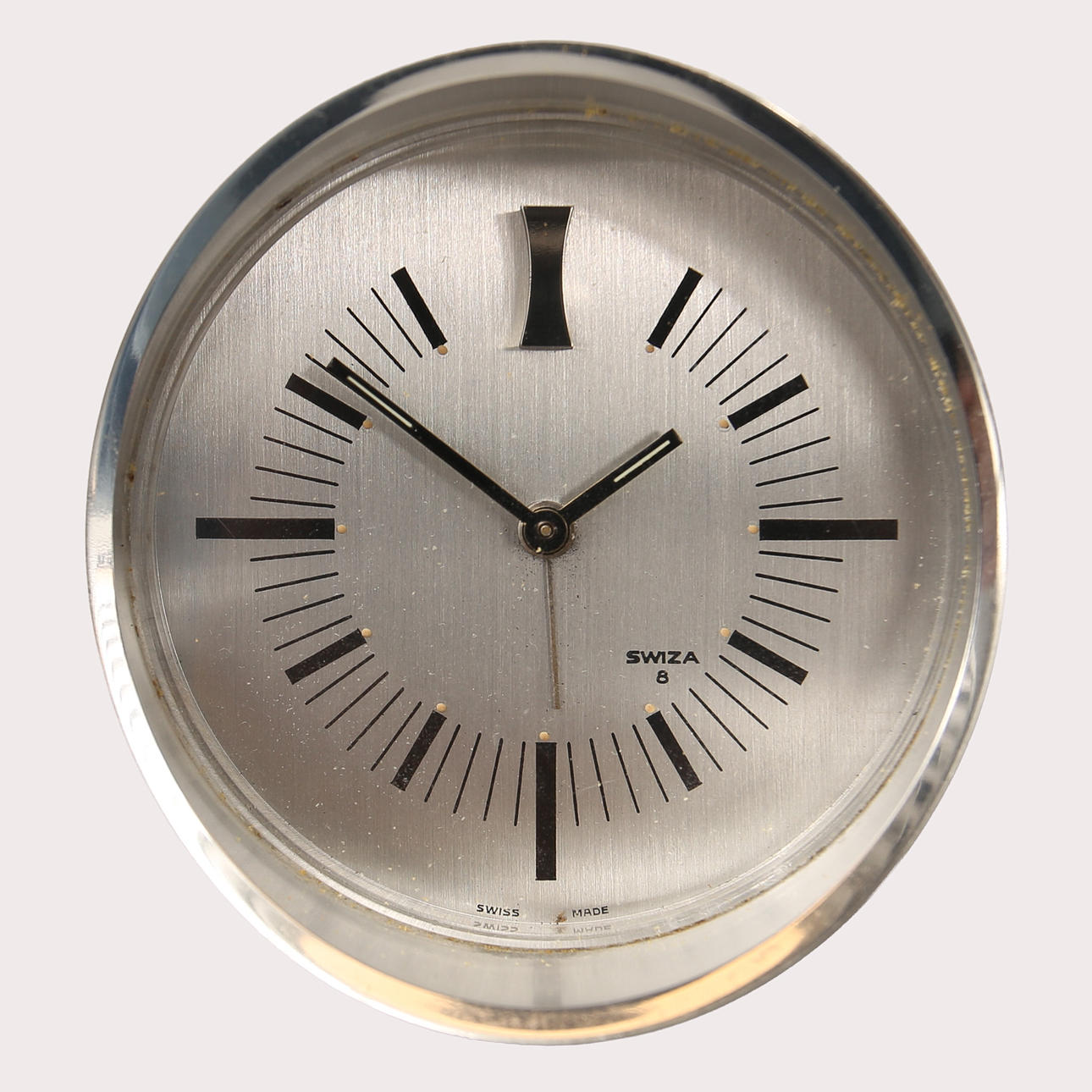 5009479. TABLE CLOCK WITH WAKE FUNCTION, metal with brushed surface, Swiza. Original carton in 1972.