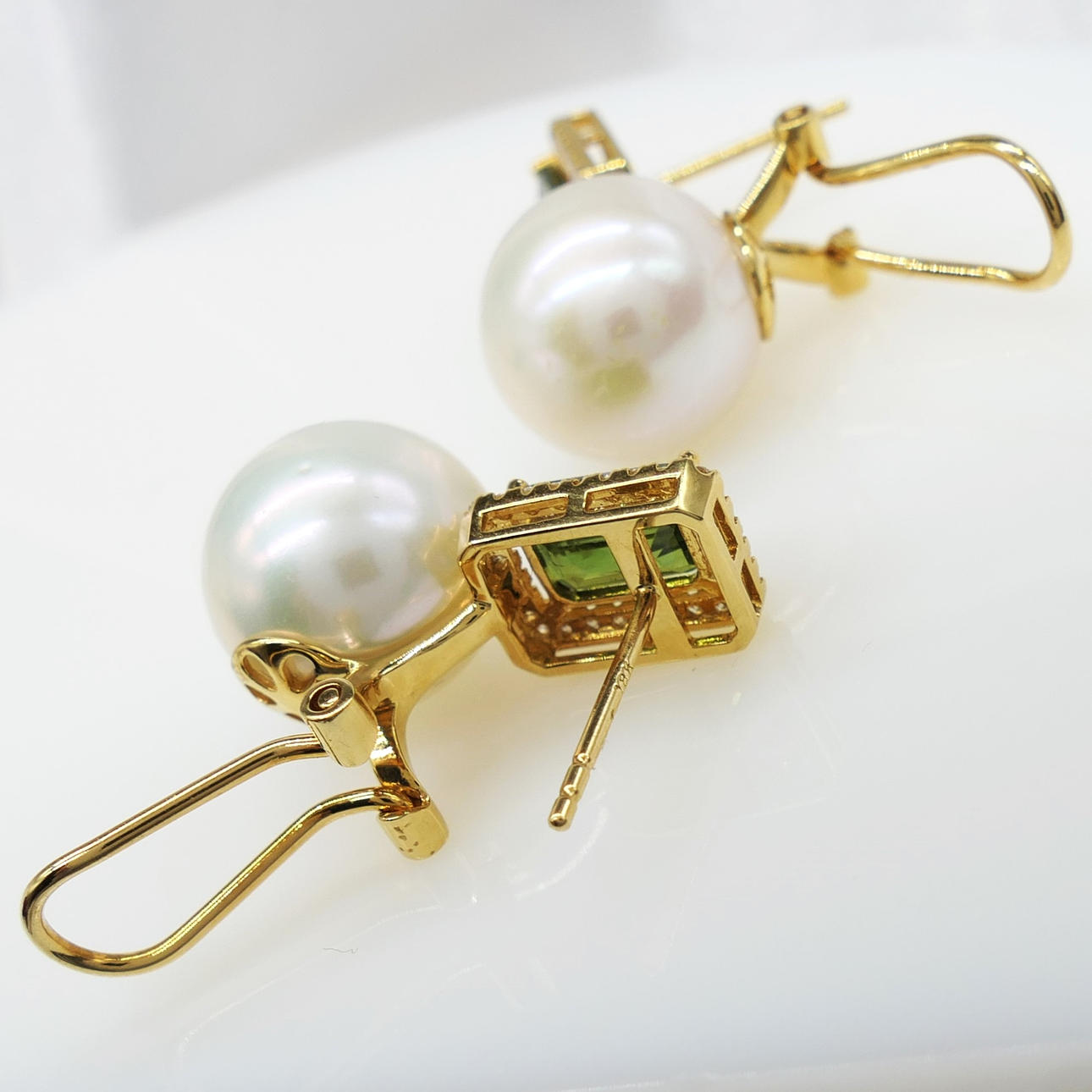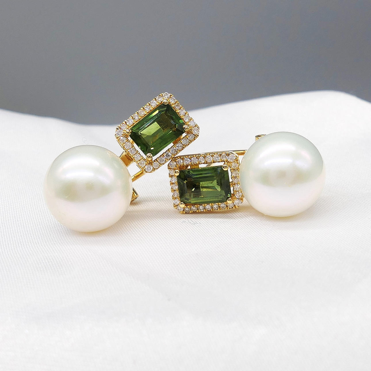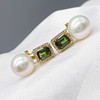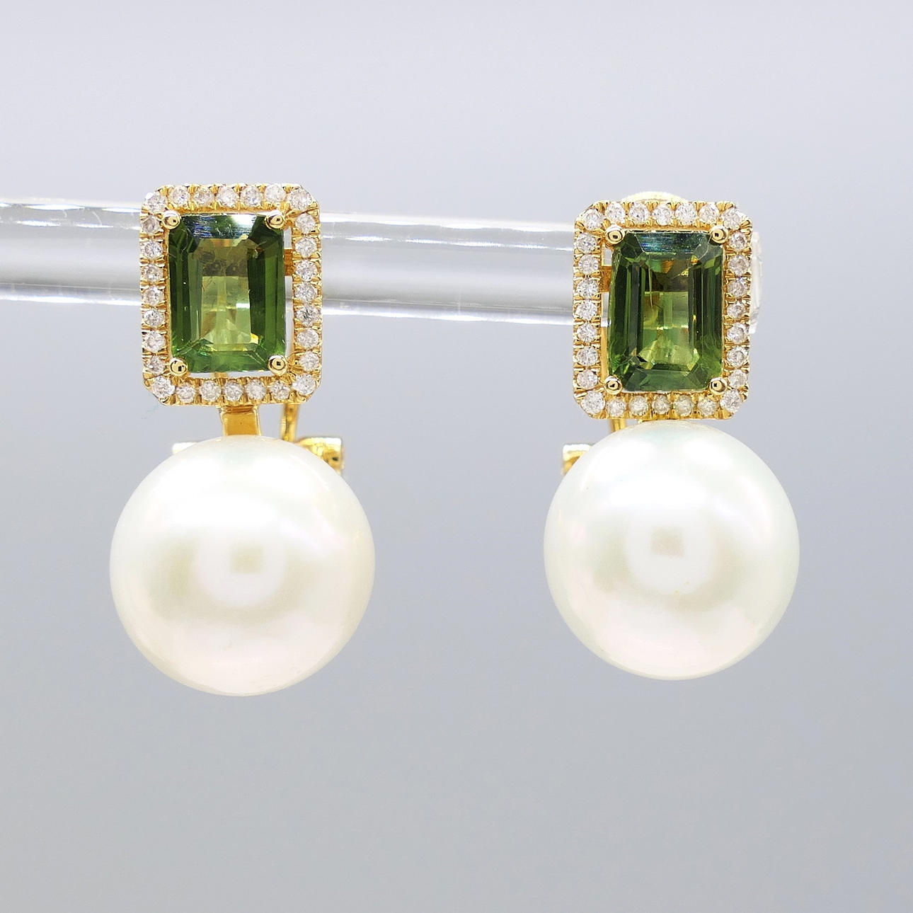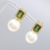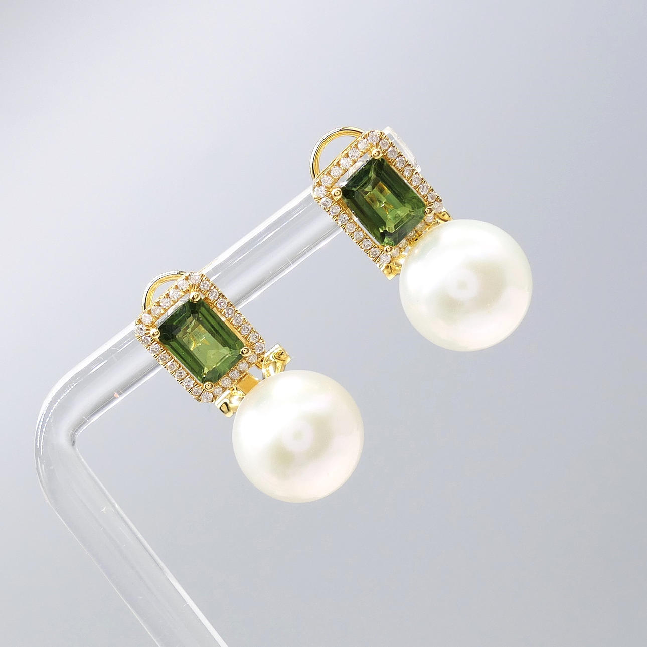A pair of 18k yellow gold pearl, tourmaline and diamond earrings with French-style clips and a gift box