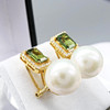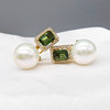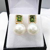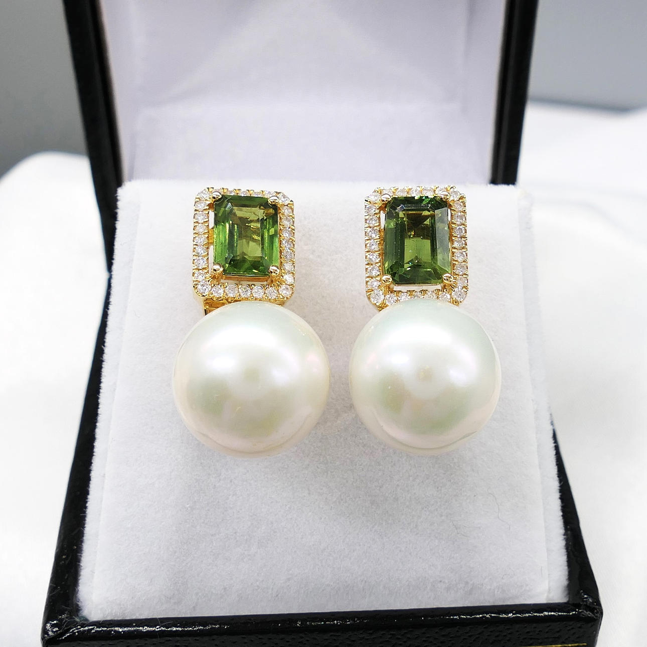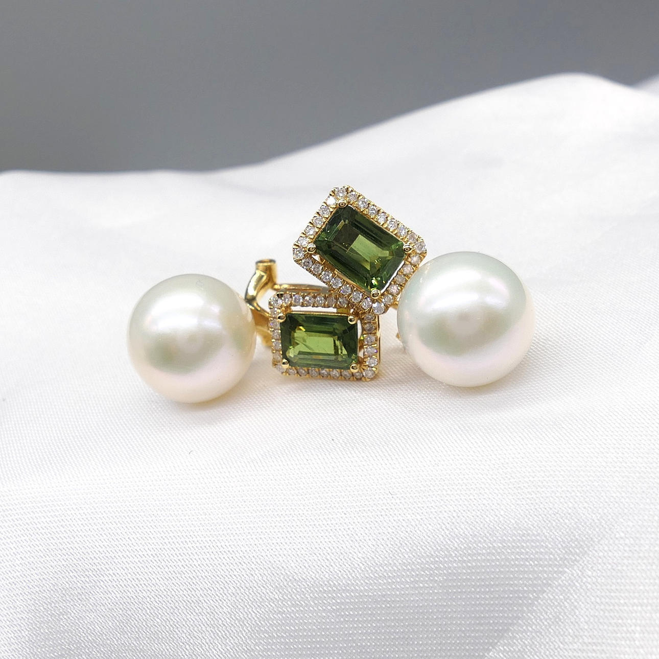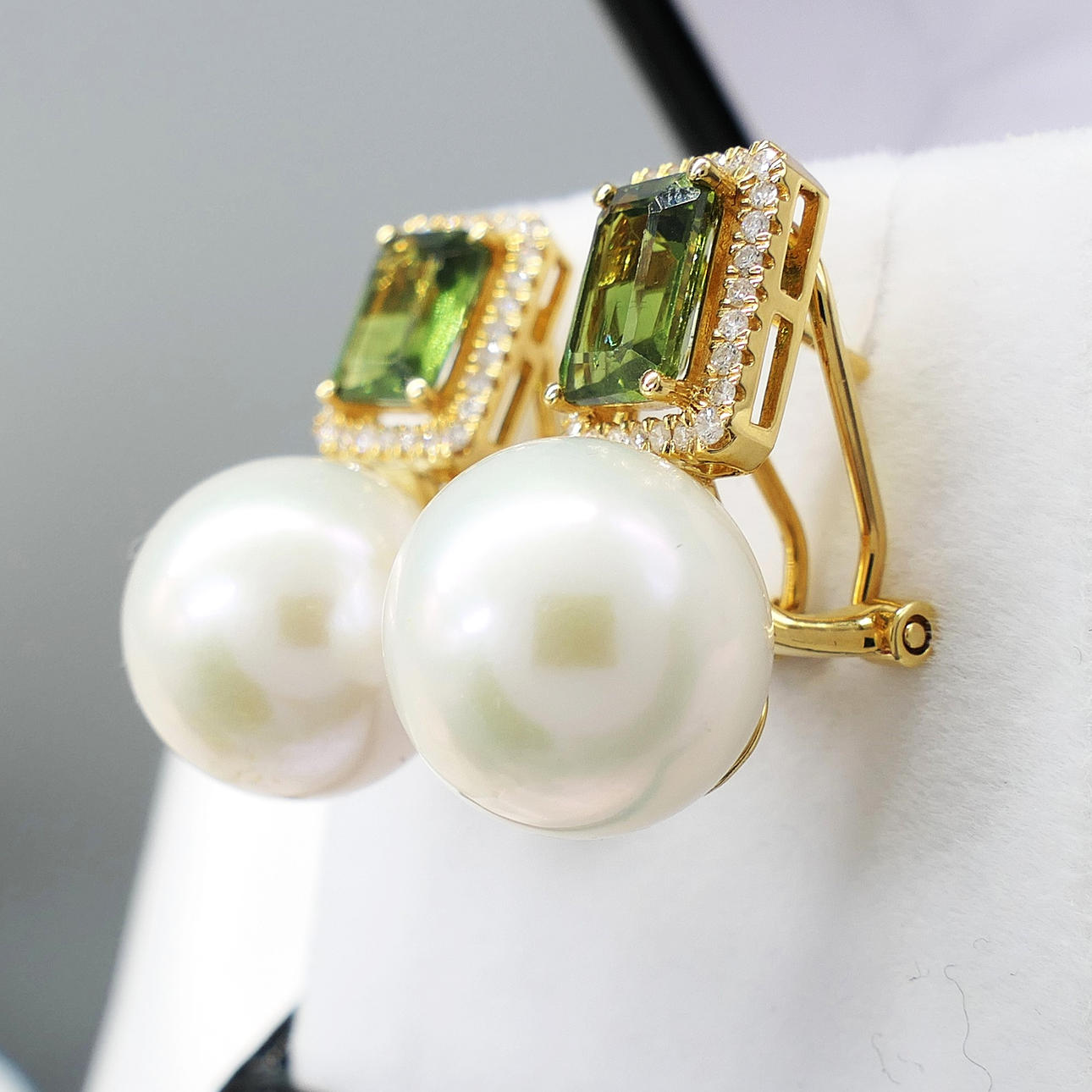 A pair of 18k yellow gold pearl, tourmaline and diamond earrings with French-style clips and a gift box