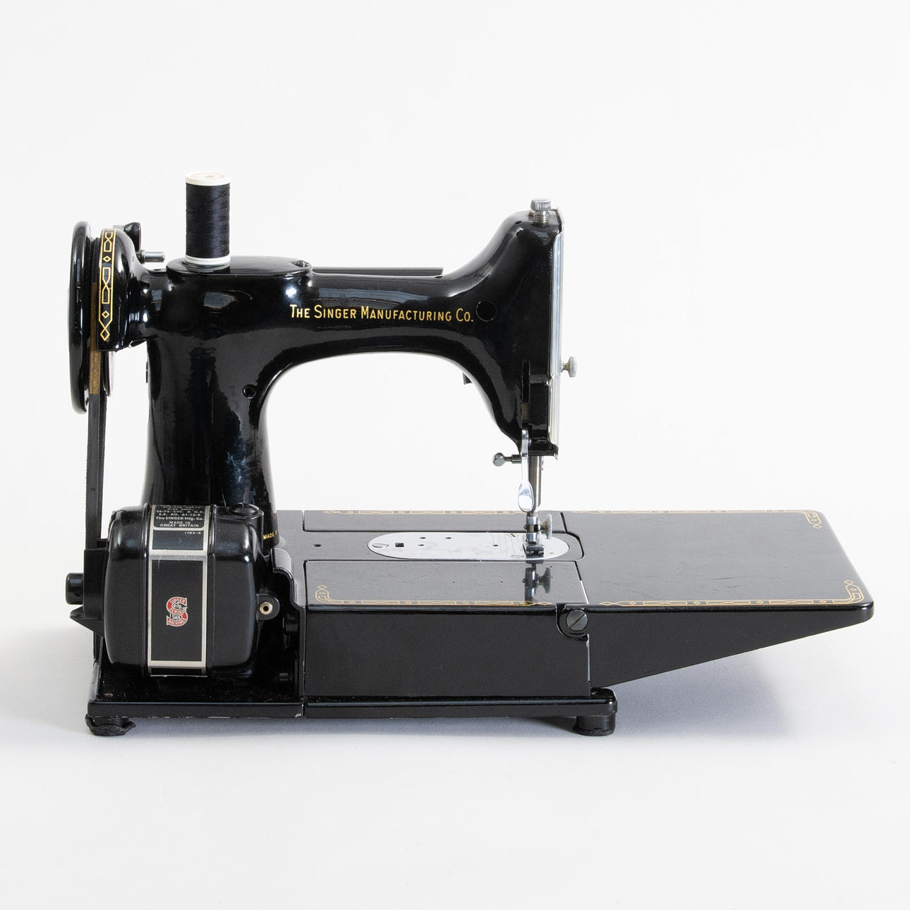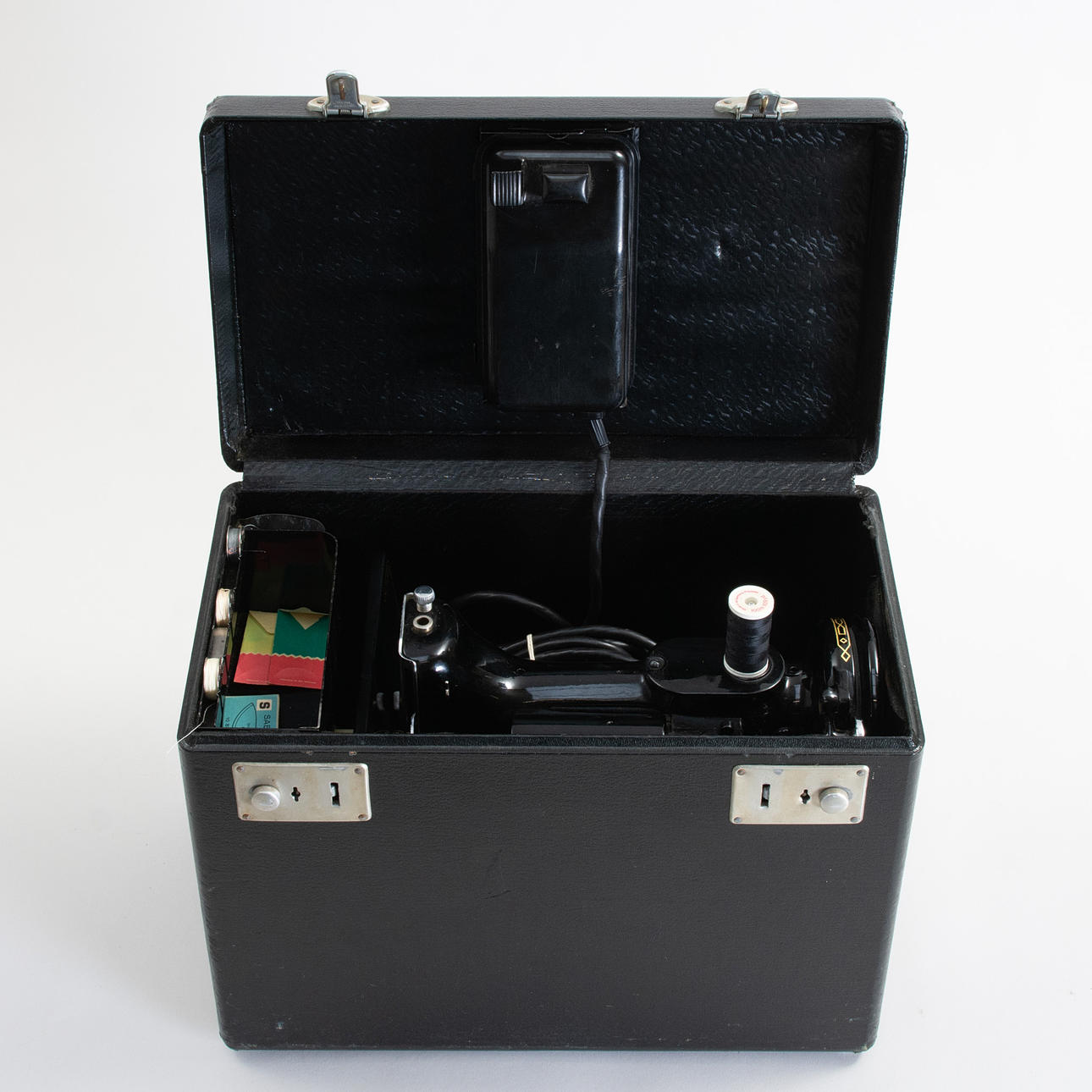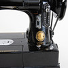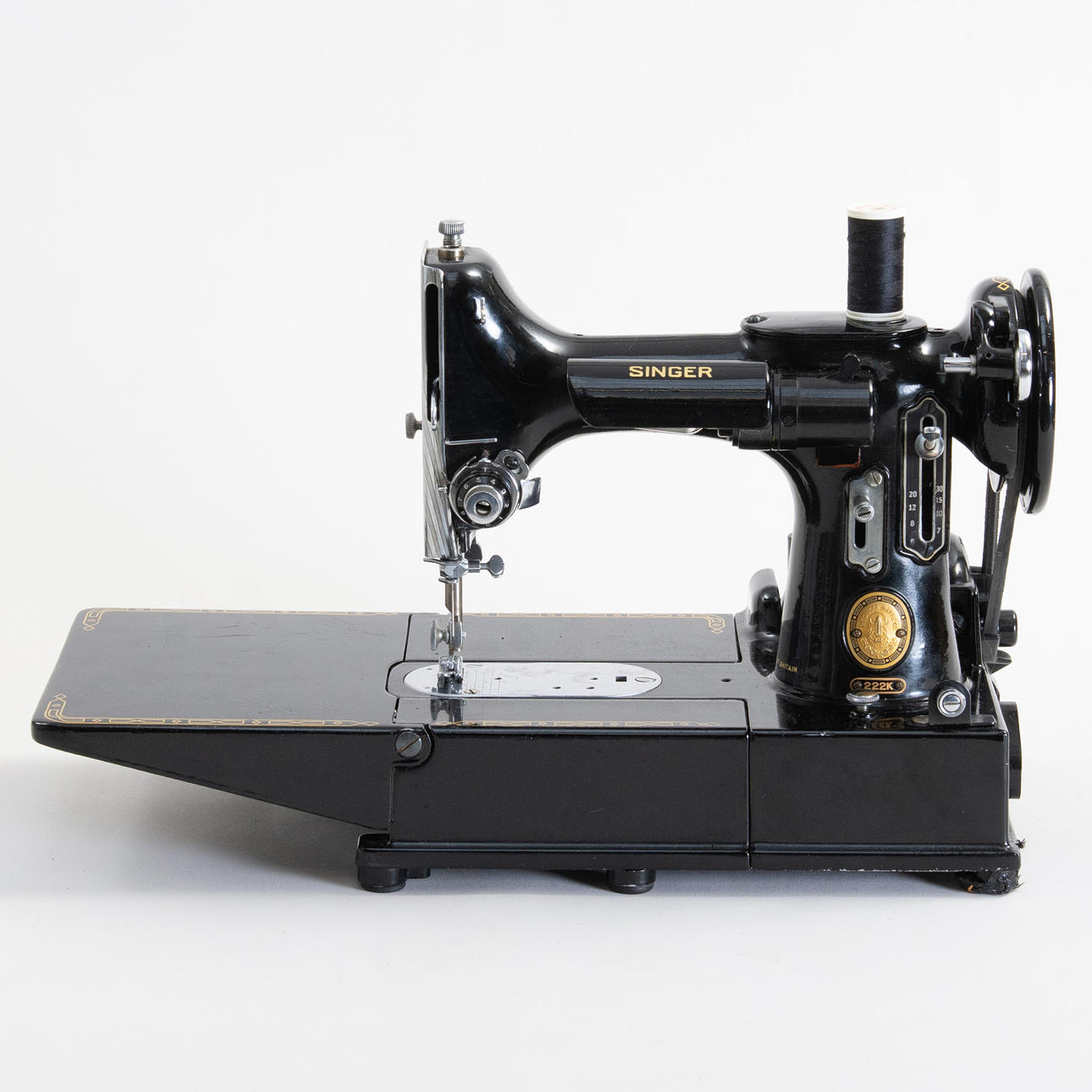 Portable sewing machine in black lacquered metal with gold foil decor, model 222K, manufactured at Singer Manufacturing Co. Free-arm construction with removable sewing bed. Tagged with the manufacturer's medallion and model plate “222K”. With original carrying case in black structural vinyl, side compartment with pressure feet and accessories, original plastic box “Singer” with extra parts/needles and Singer sewing machine oil in can. Foot pedal with cable.