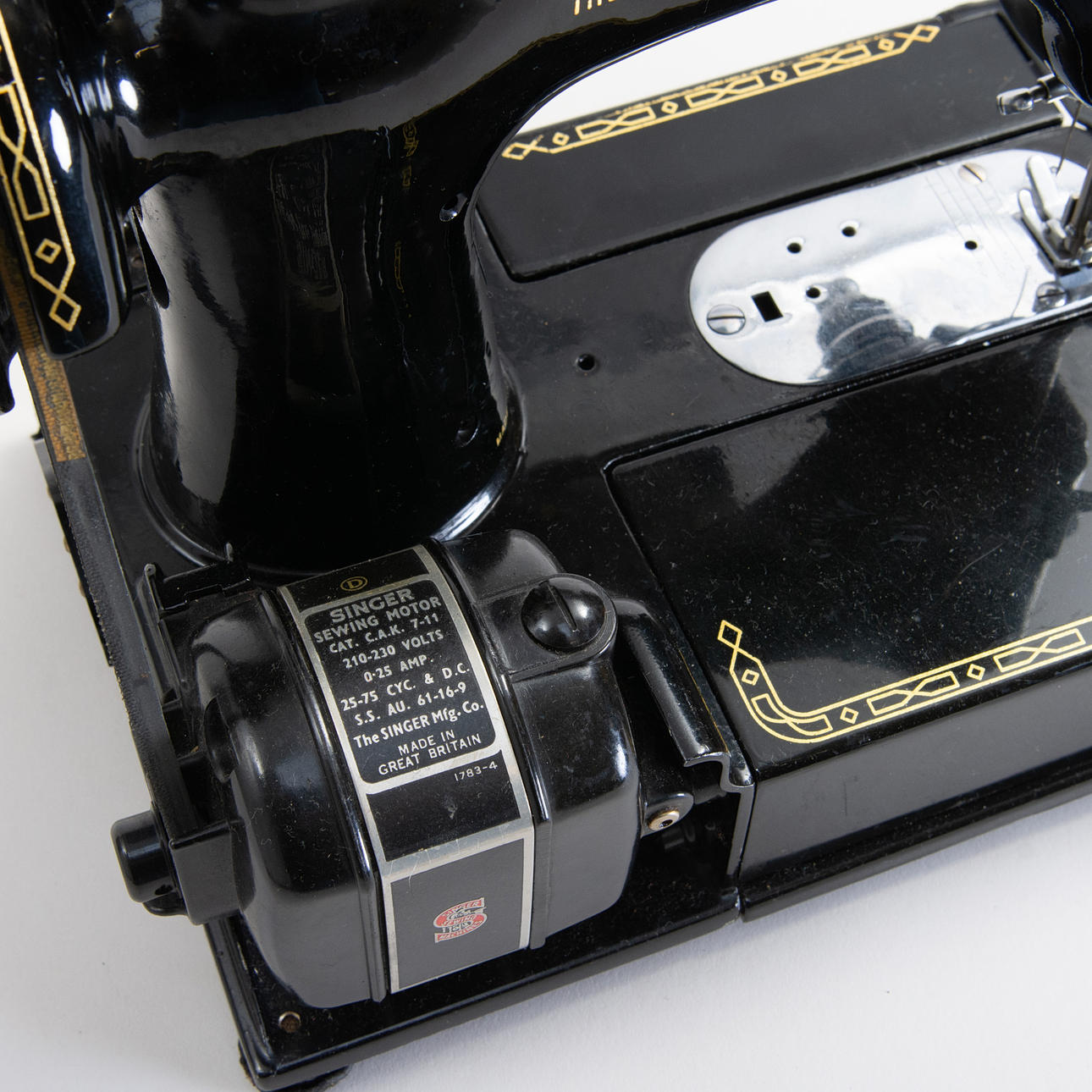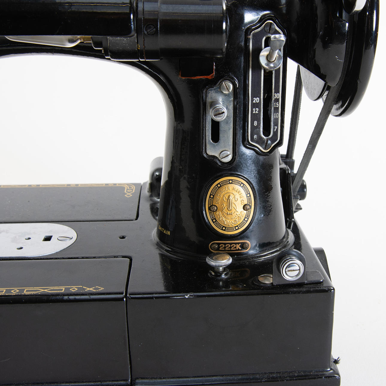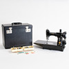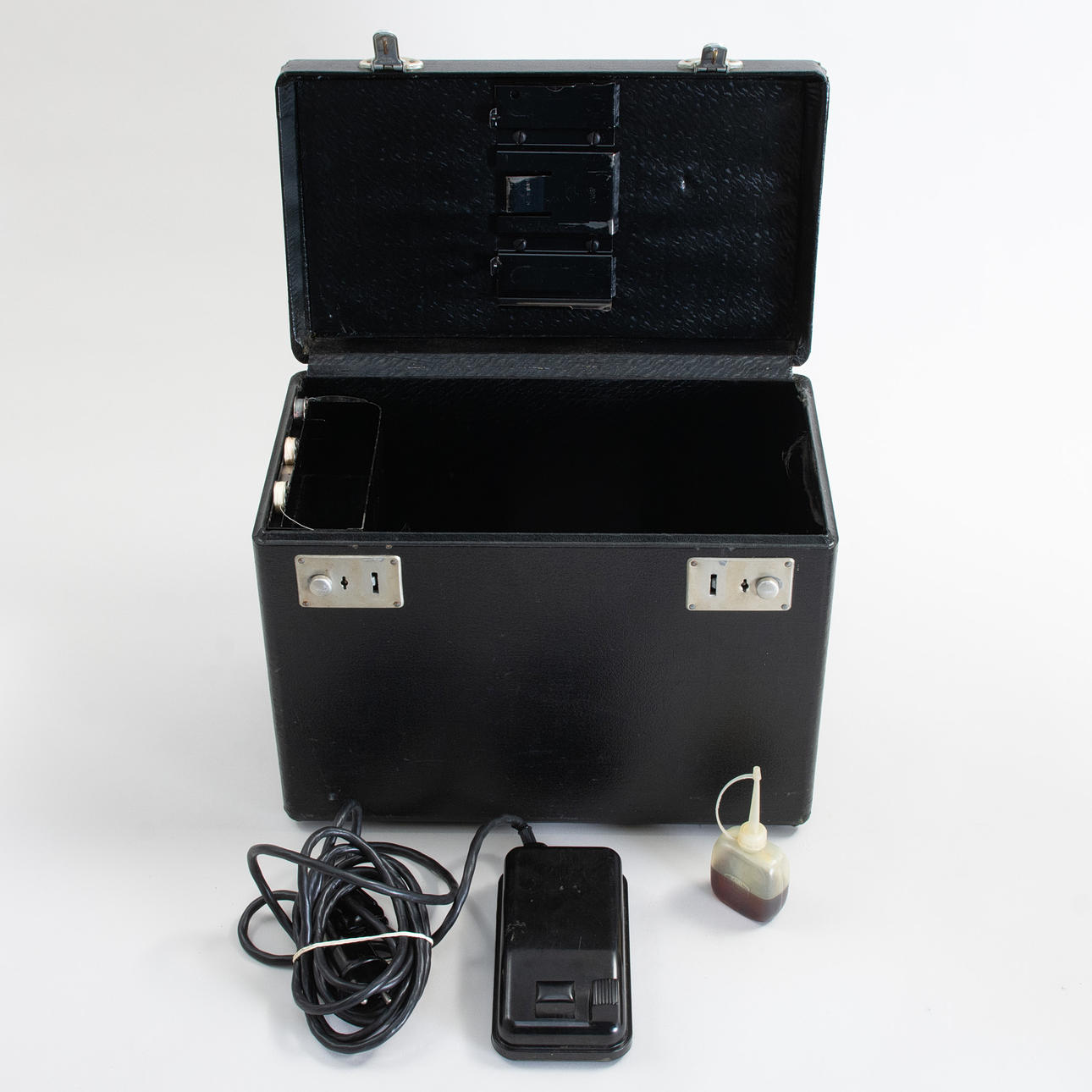 Portable sewing machine in black lacquered metal with gold foil decor, model 222K, manufactured at Singer Manufacturing Co. Free-arm construction with removable sewing bed. Tagged with the manufacturer's medallion and model plate “222K”. With original carrying case in black structural vinyl, side compartment with pressure feet and accessories, original plastic box “Singer” with extra parts/needles and Singer sewing machine oil in can. Foot pedal with cable.
