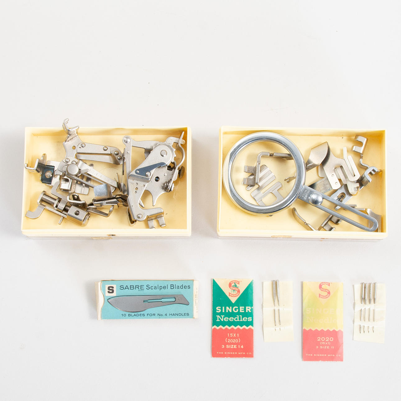 SINGER FEATHERWEIGHT MODEL 222K sewing machine with accessories.