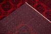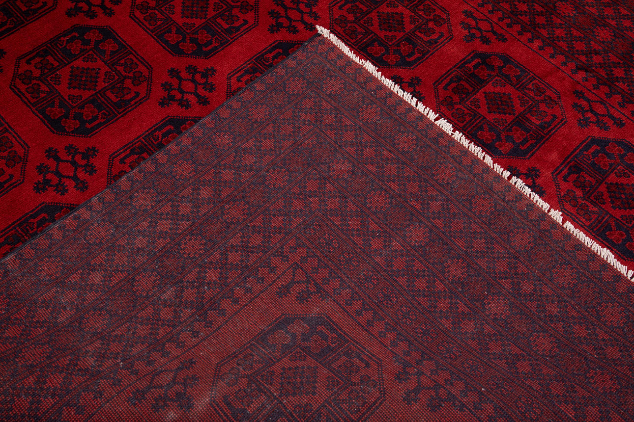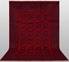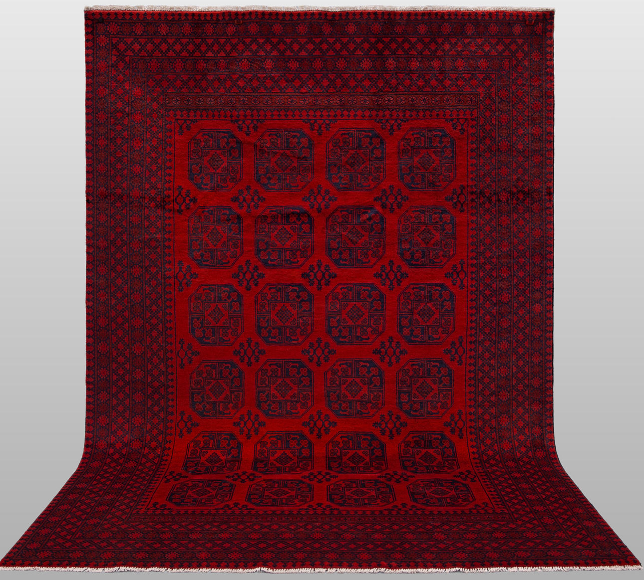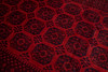 Afghan with a red ground colour and a centre field covered in repeated lake motifs in dark blue and dark yellow details. The border consists of several frames with geometric patterns in similar colors. The bangs are made of wool and the warp is made of cotton.