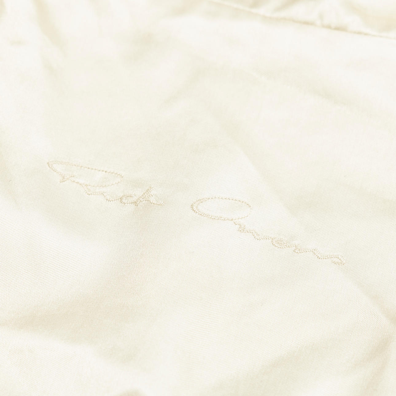 Figure-fitting jacket with shawl collar and zipper in greige (colour pearl) suede velvet with elasticated sleeves. Fully lined in beige cupro. Embroidered marked “Rick Owen”. Enl marking size IT42/GB 10/US8.