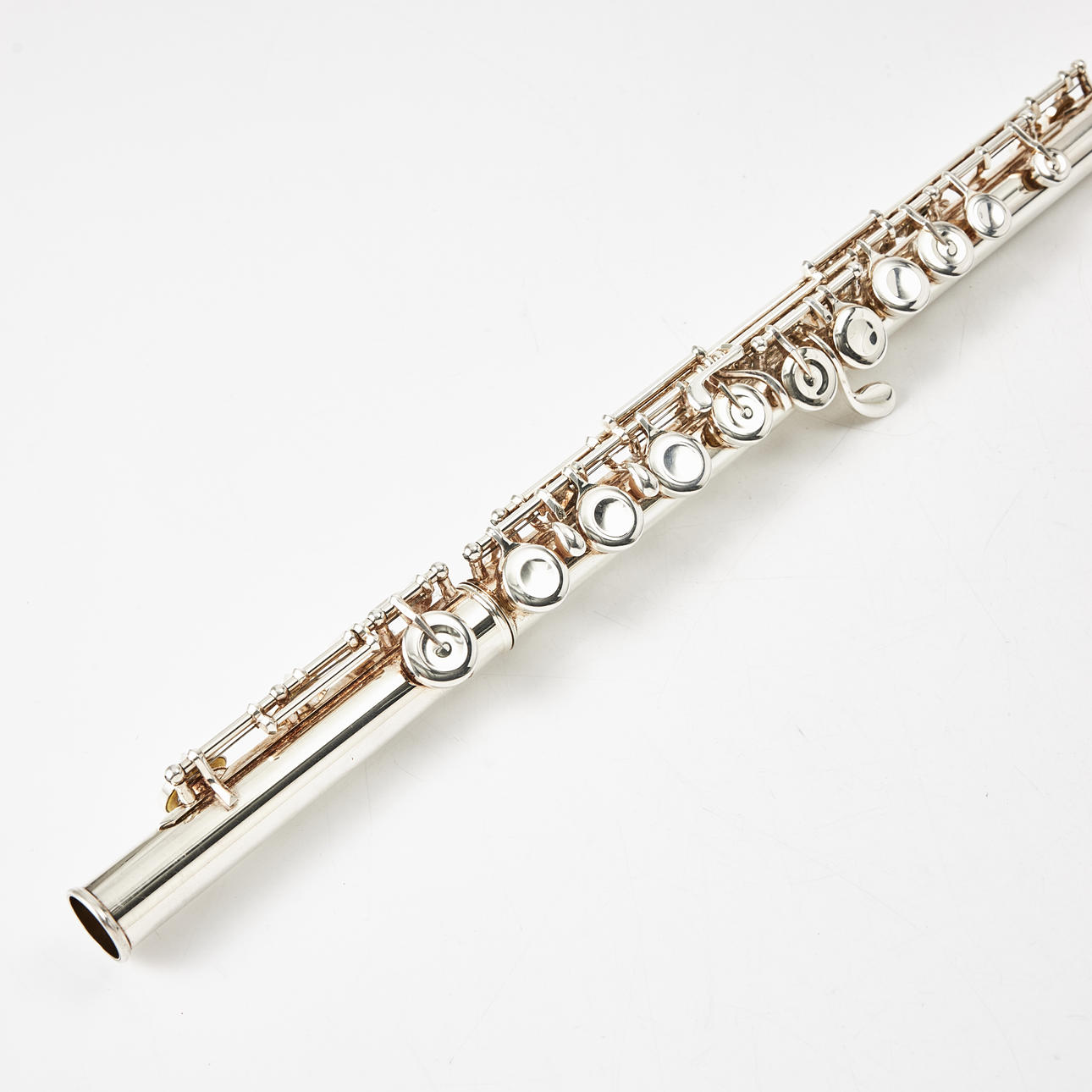 The flute marked Pearl Flute PF-505 and with serial number, in case and with lined bag, bag height 6, 42,5 x 11 cm.