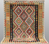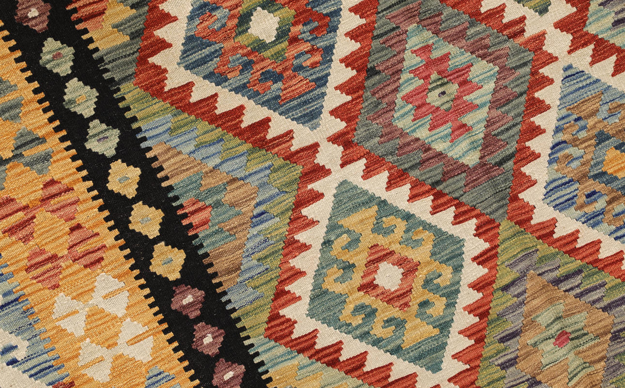 Hand-woven Kelim in classic design with geometric pattern in polychrome color scale.